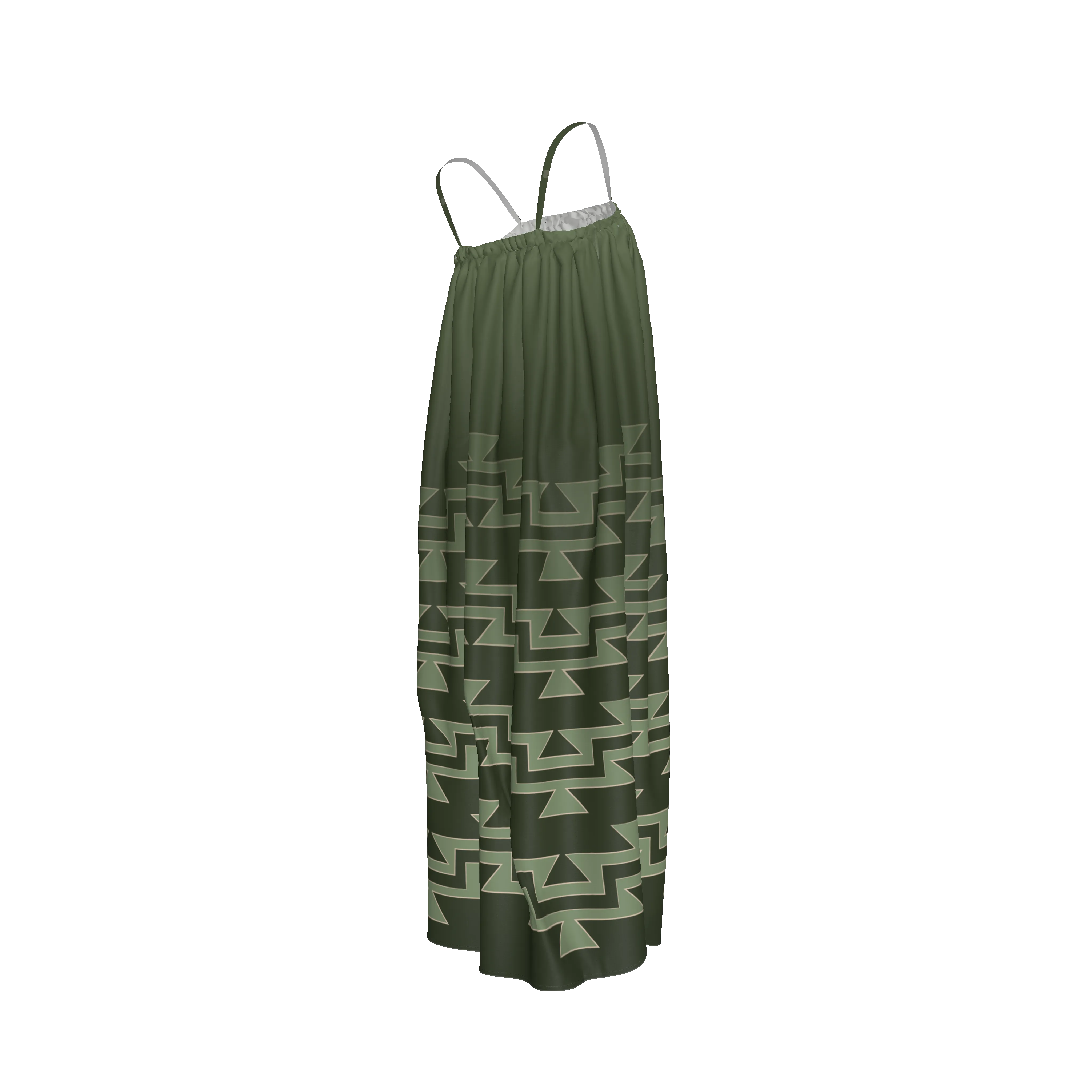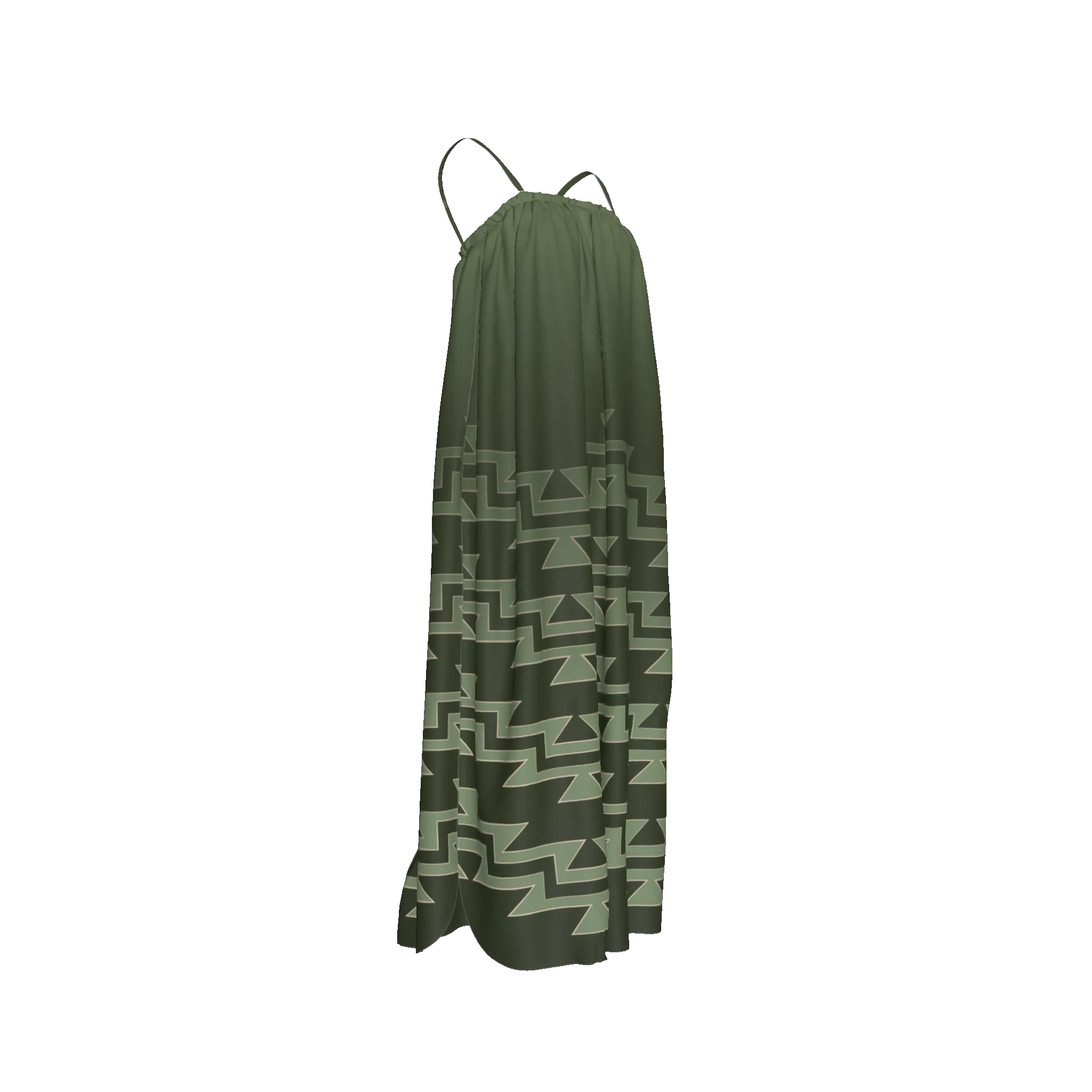 Meet your new go-to for effortless style: the Shirttail Camisole Dress. Crafted from 100% lightweight organic cotton twill with a softly brushed finish, this dress feels as good as it looks. The rich olive green base is highlighted by a bold geometric pattern of zig-zags and arrows in lighter sage, creating a modern, art-inspired look. With its relaxed silhouette and digitally printed statement motif, this dress is perfect for both laid-back days and casual evenings. Comfortable, eco-friendly, and eye-catching—this is easy dressing done right.