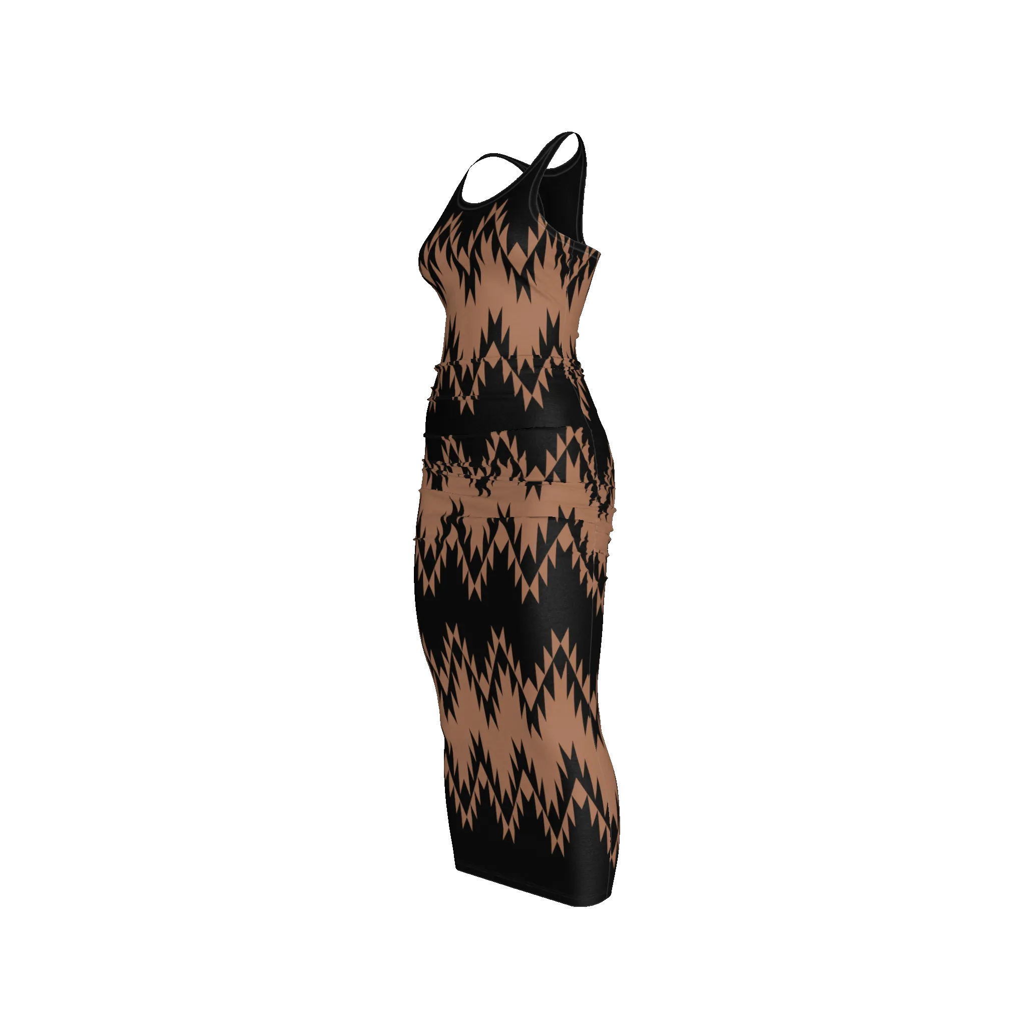 Make a bold statement with our Racerback Shirred Tank Dress, crafted from 100% lightweight organic cotton jersey. This dress features a striking geometric zigzag motif in warm tan and deep black, arranged in eye-catching angular patterns that wrap around the silhouette. The digitally printed artwork brings a dynamic edge to this classic racerback shape, balancing modern flair with everyday comfort. Perfect for day-to-night wear, layer it with your favorite accessories for an effortlessly cool look.