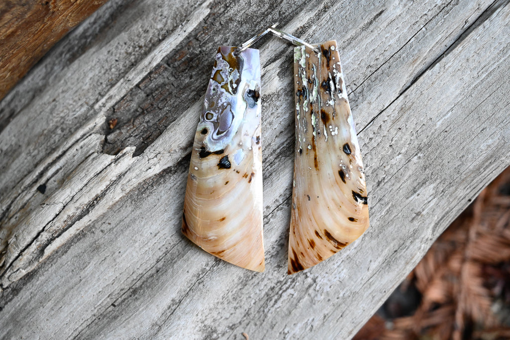 River Mussel Shell Earrings by Cawtep Sylvia– gathered from Northern California river mussels in the summer months and hand carved by the artist. Each iridescent shell catches the light beautifully, creating a shiny, lightweight earring that feels easy to wear and goes with absolutely anything.