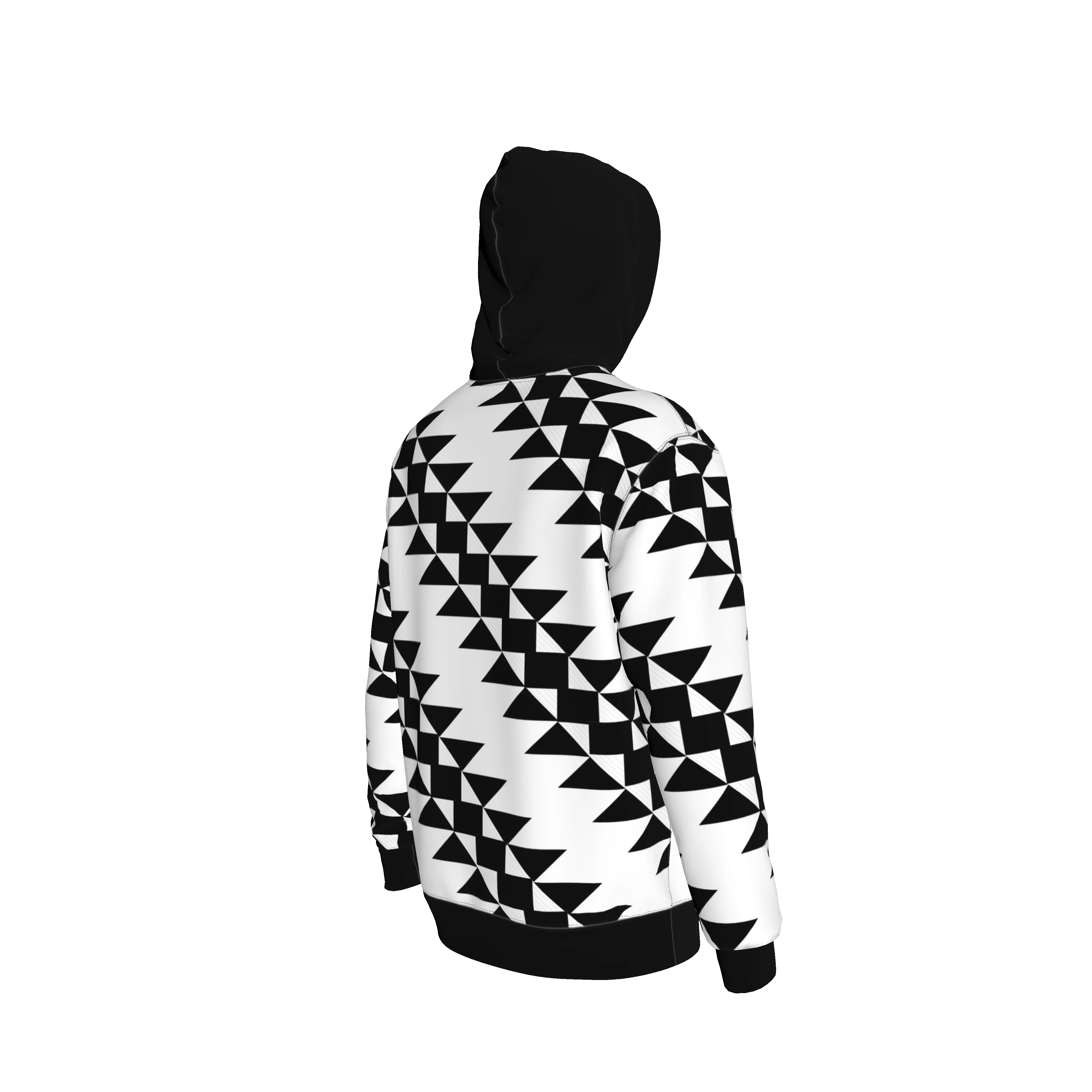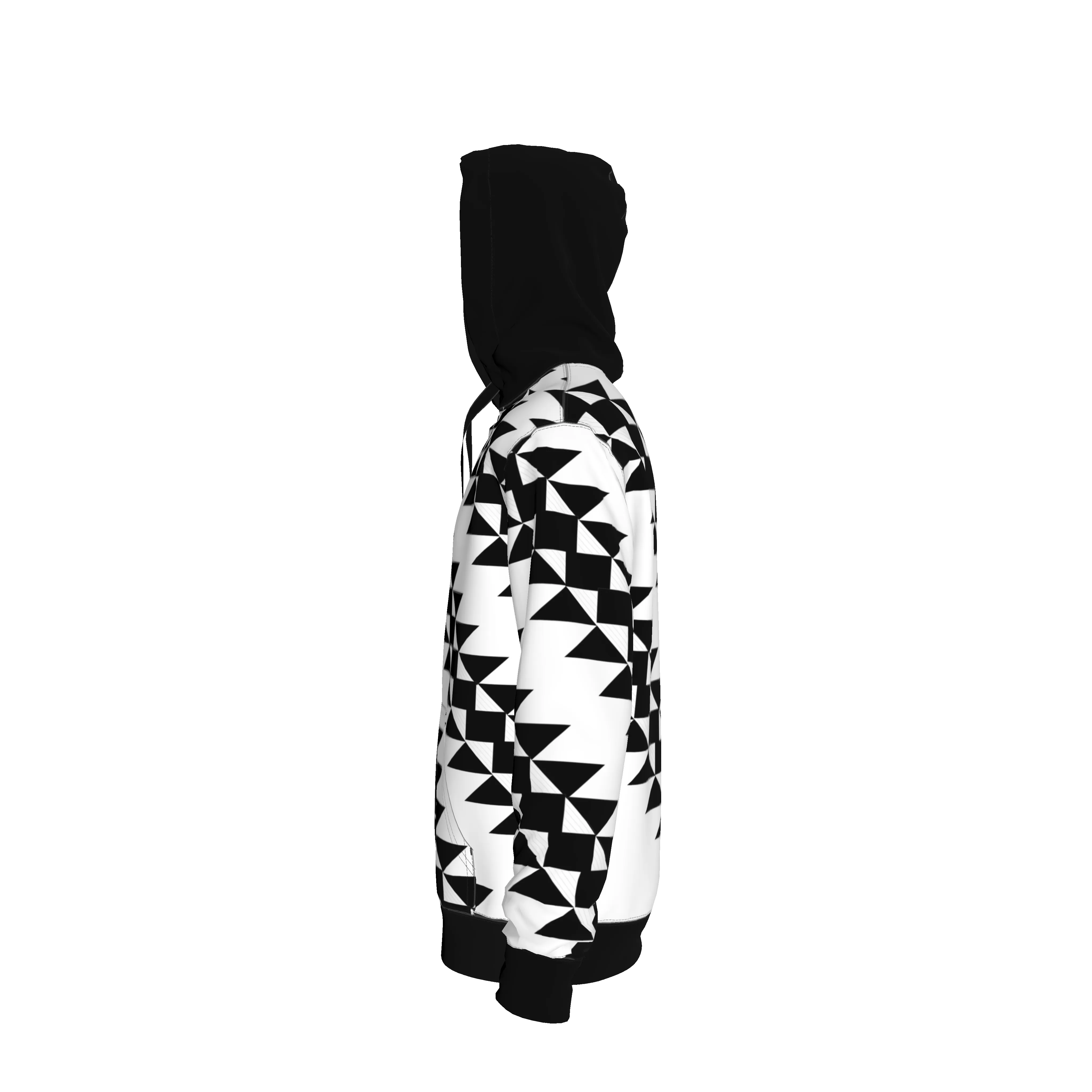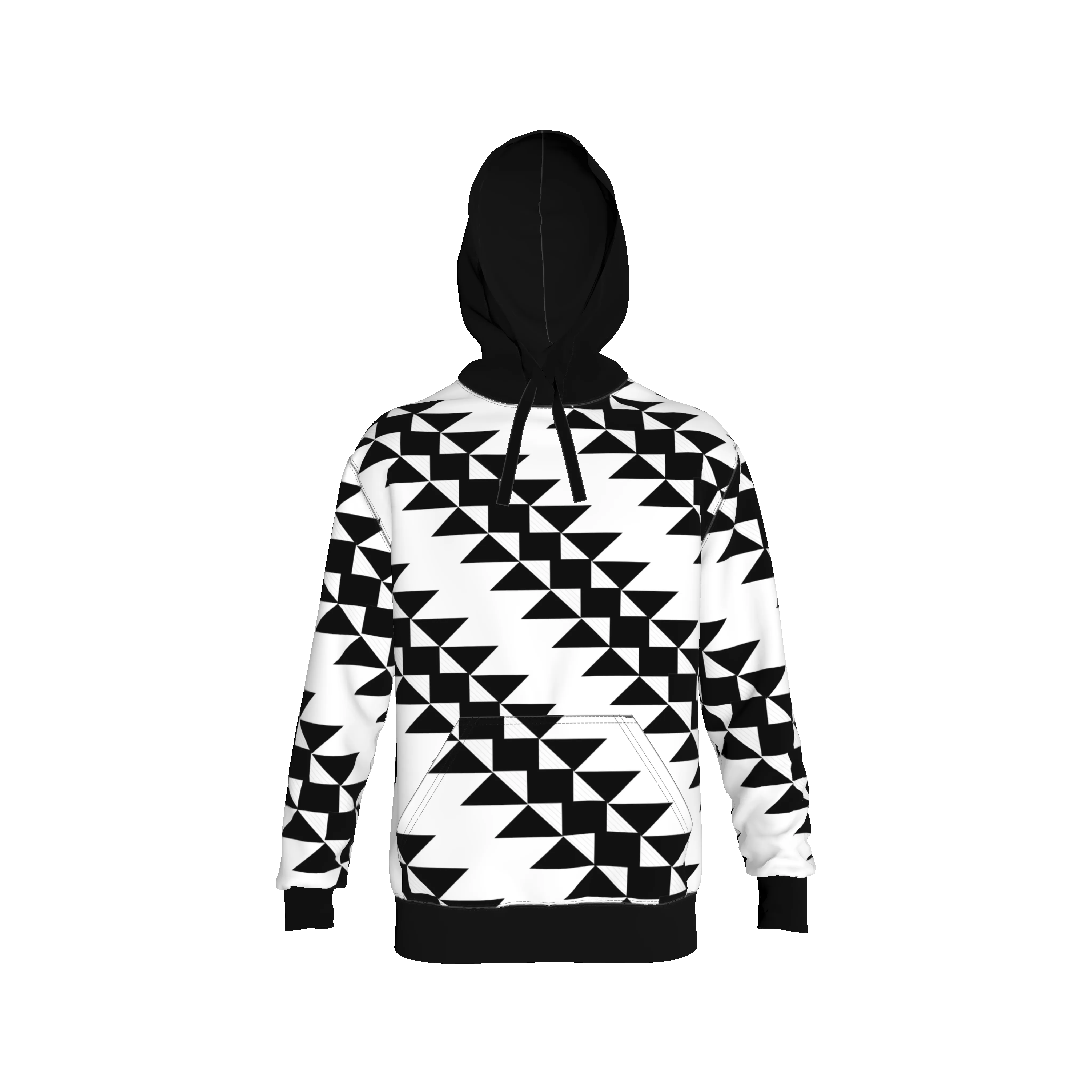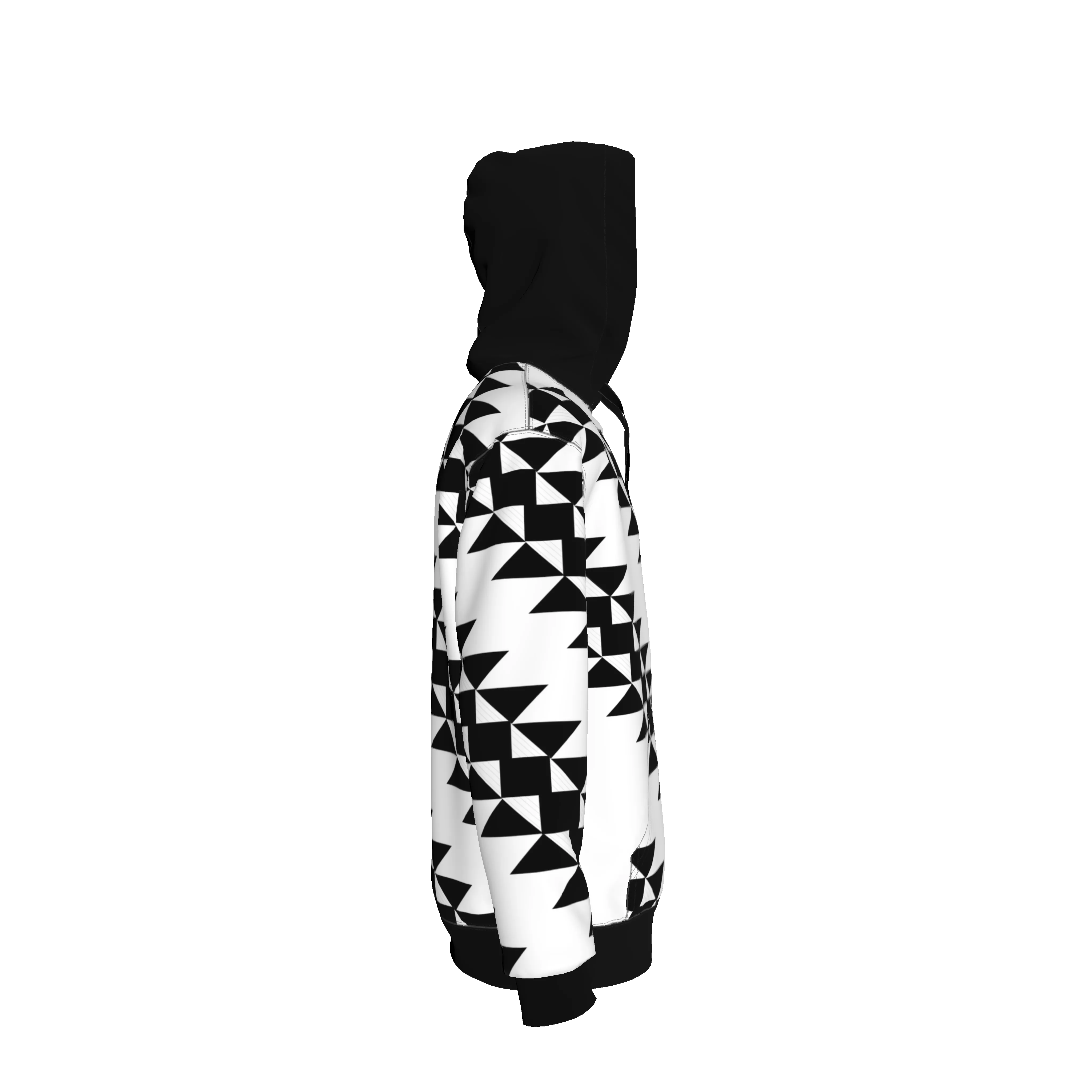 Step up your style with our Basic Hoodie, featuring a bold, geometric black-and-white print. The eye-catching pattern is made up of diagonal rows of solid black triangles set against a crisp white background, creating a dynamic, modern look. The hood and cuffs are solid black for a clean finish. Crafted from luxurious, heavyweight Organic Cotton Spandex French Terry, this hoodie feels ultra-soft yet holds its shape beautifully. Perfect for everyday wear, it combines stand-out design with unbeatable comfort and structure.