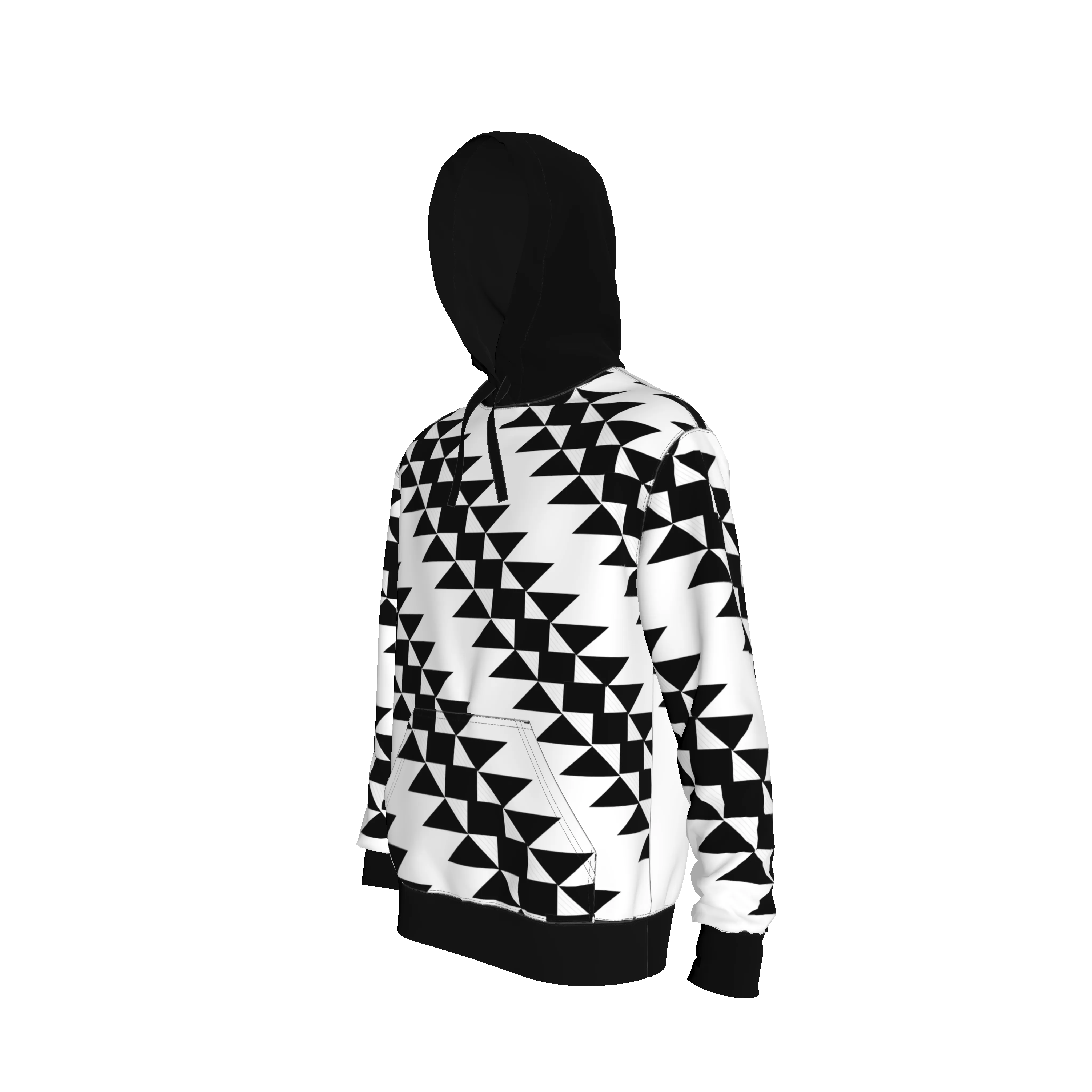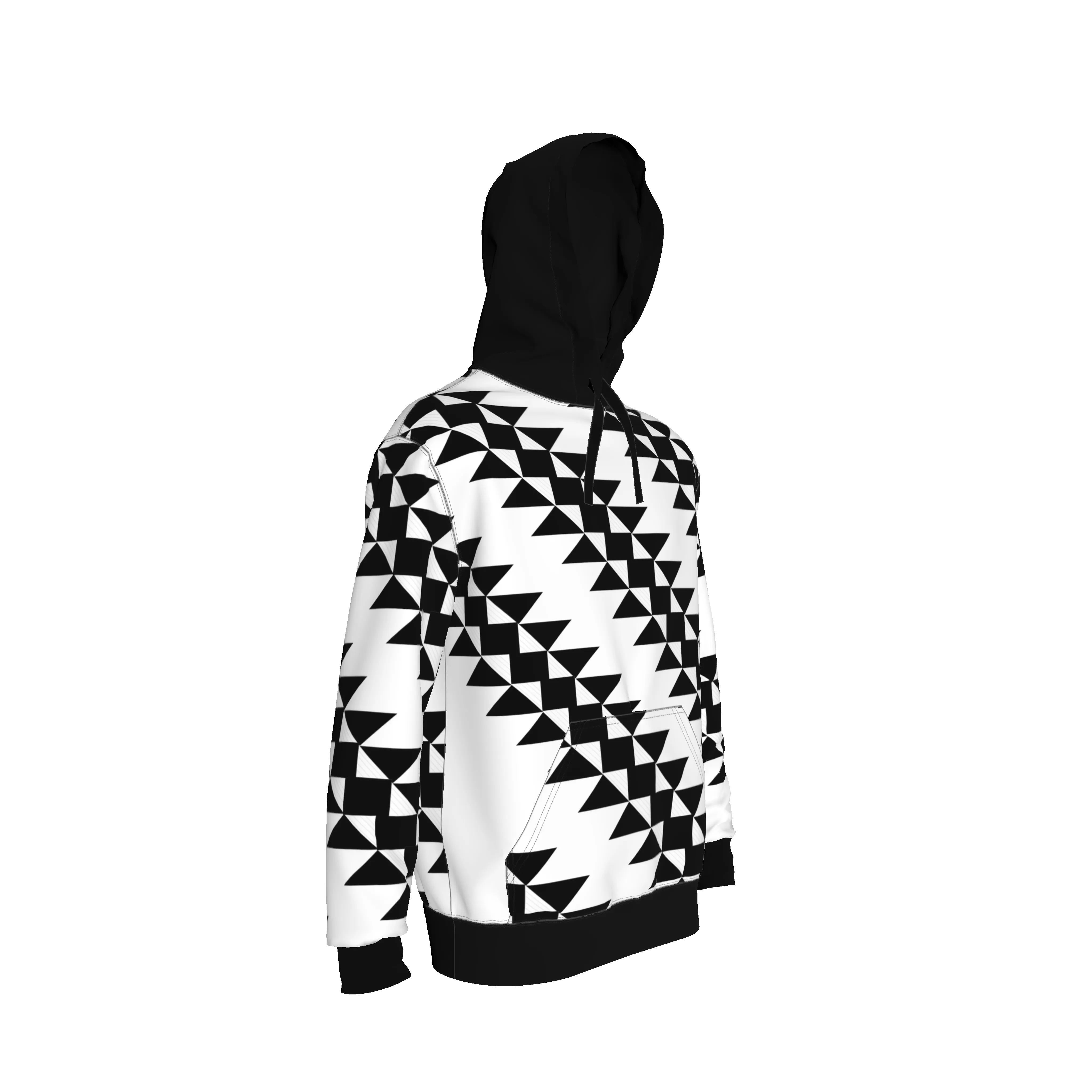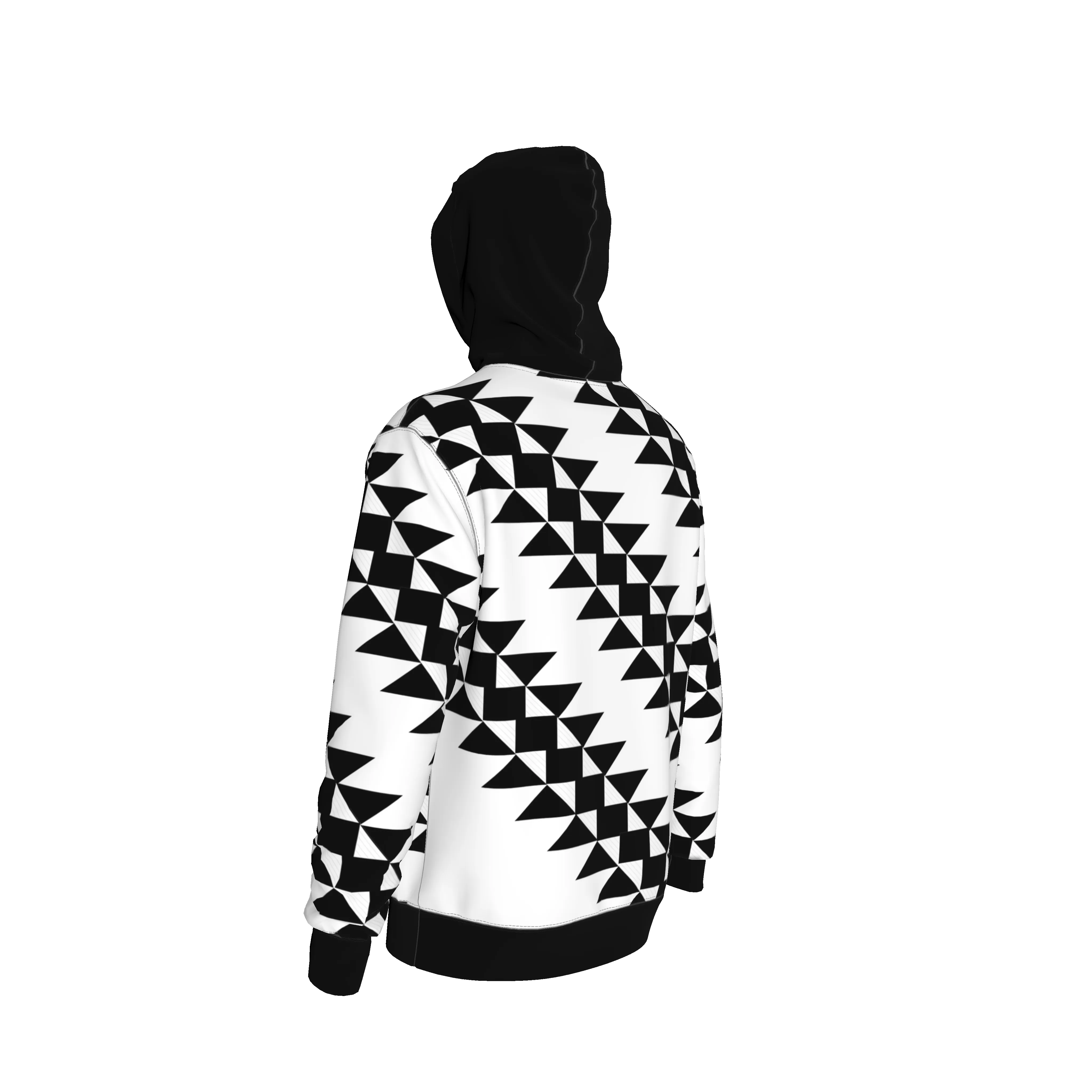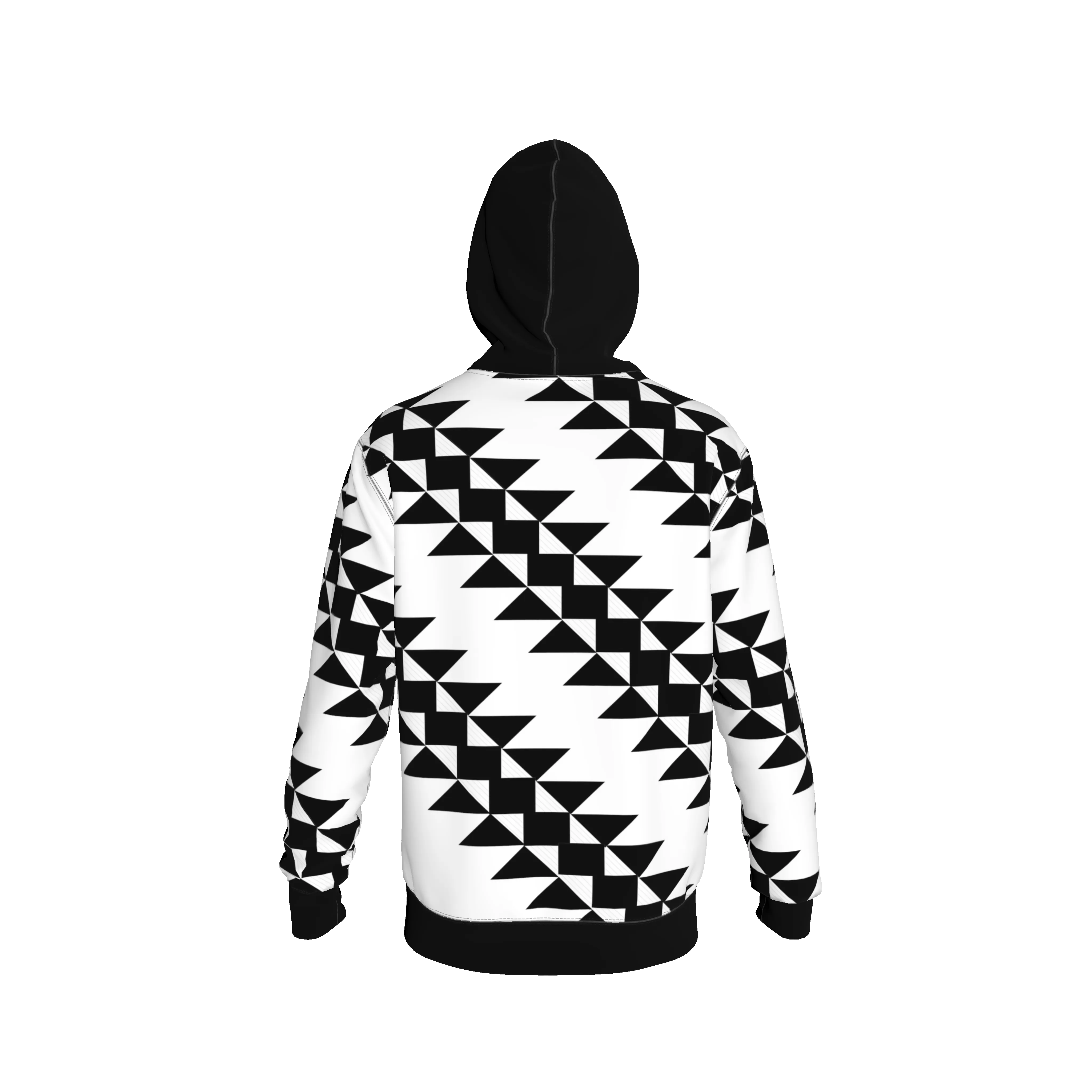 Step up your style with our Basic Hoodie, featuring a bold, geometric black-and-white print. The eye-catching pattern is made up of diagonal rows of solid black triangles set against a crisp white background, creating a dynamic, modern look. The hood and cuffs are solid black for a clean finish. Crafted from luxurious, heavyweight Organic Cotton Spandex French Terry, this hoodie feels ultra-soft yet holds its shape beautifully. Perfect for everyday wear, it combines stand-out design with unbeatable comfort and structure.