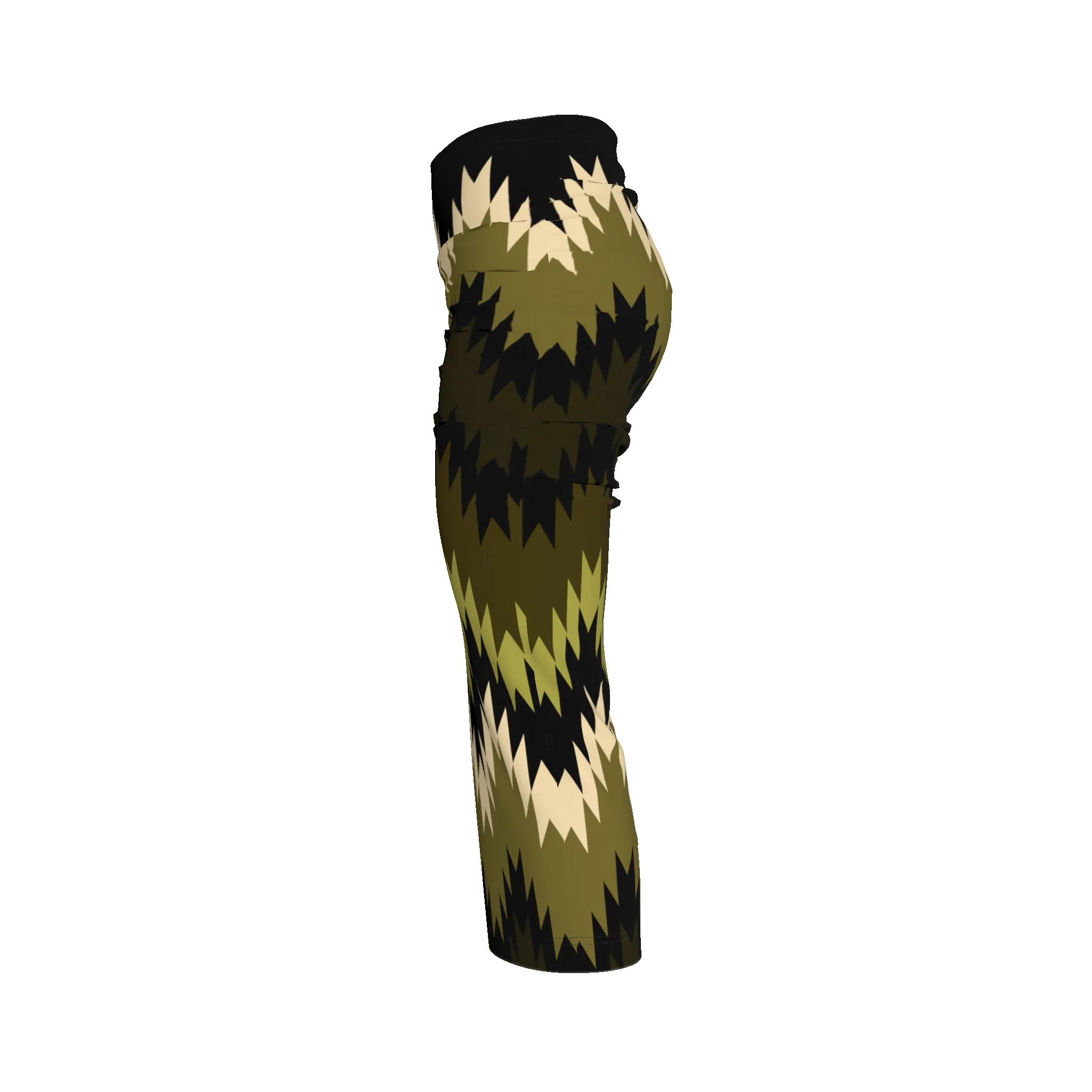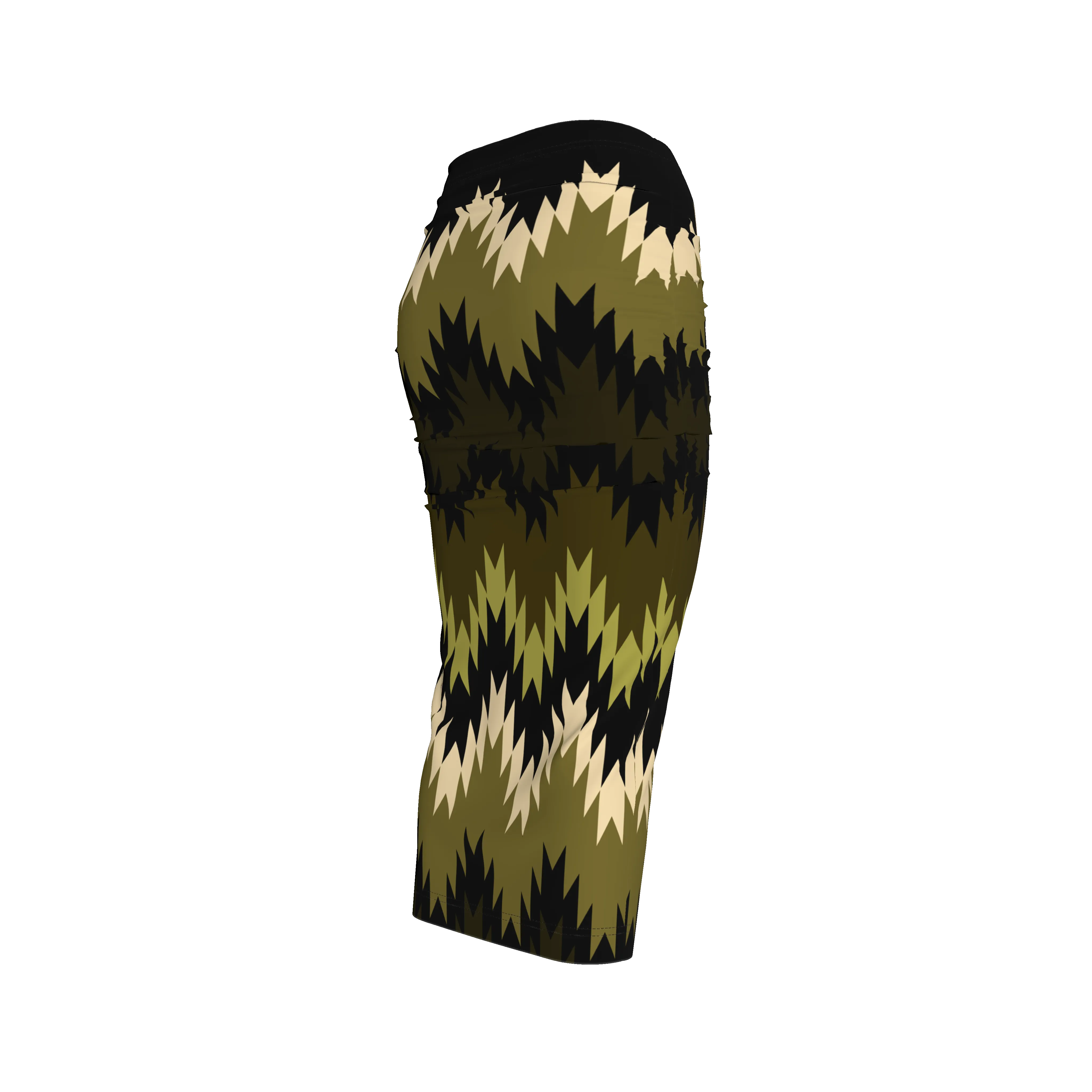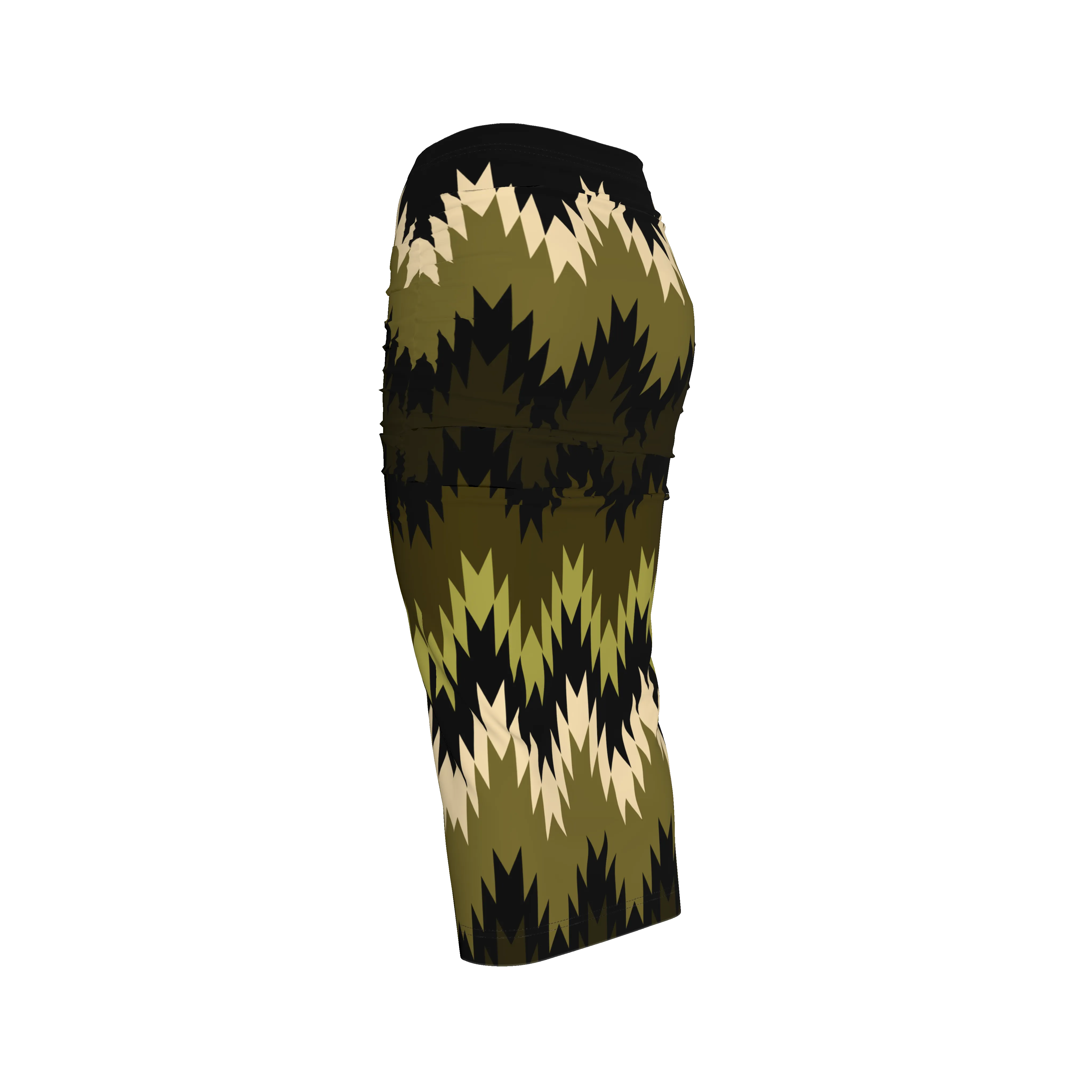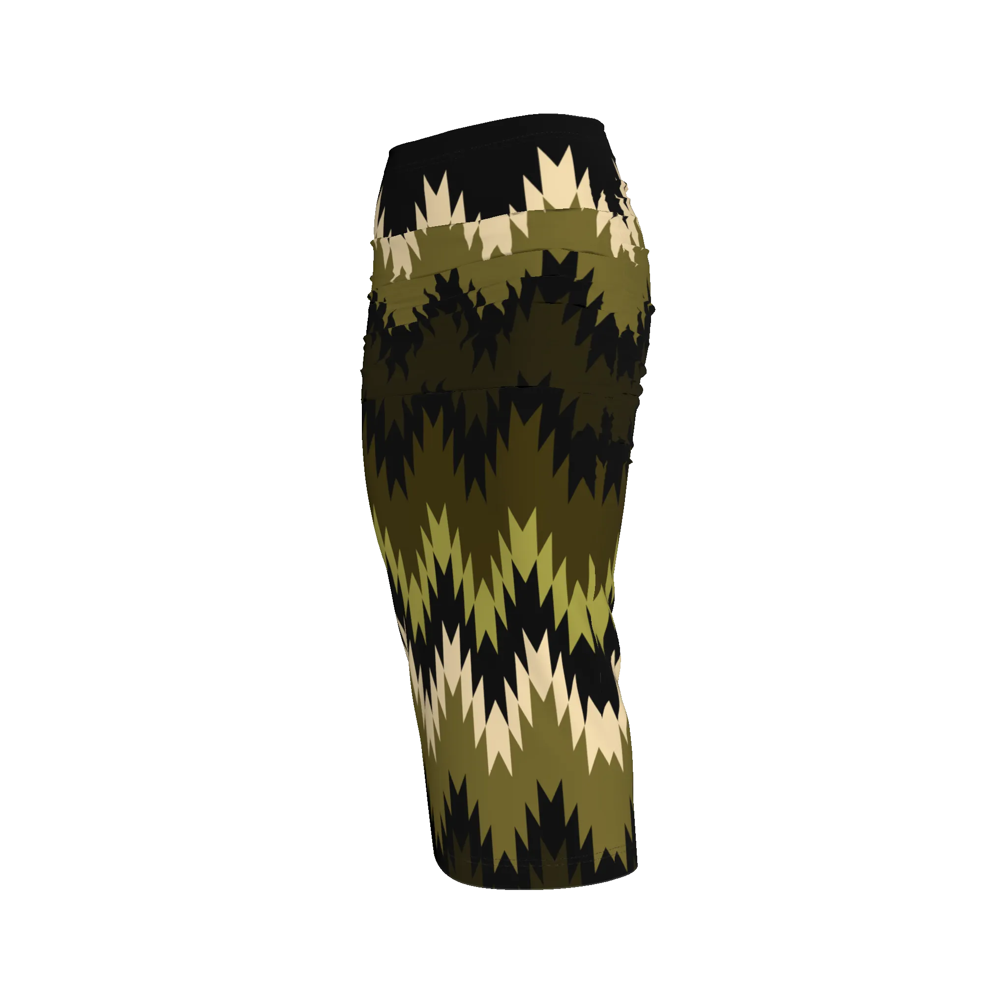 Step out in standout style with the Green Swallow Tail pencil Shirred Midi Skirt. Crafted from 100% lightweight organic cotton jersey, this skirt showcases a bold, geometric swallowtail pattern in shades of olive green, cream, and black. The sharp chevron motifs create a dynamic, eye-catching visual flow from waist to hem. The shirred waistband ensures a comfortable and flattering fit, making it perfect for all-day wear. Pair it with a simple tee or a fitted blouse for a fresh, modern look that’s as effortless as it is memorable.