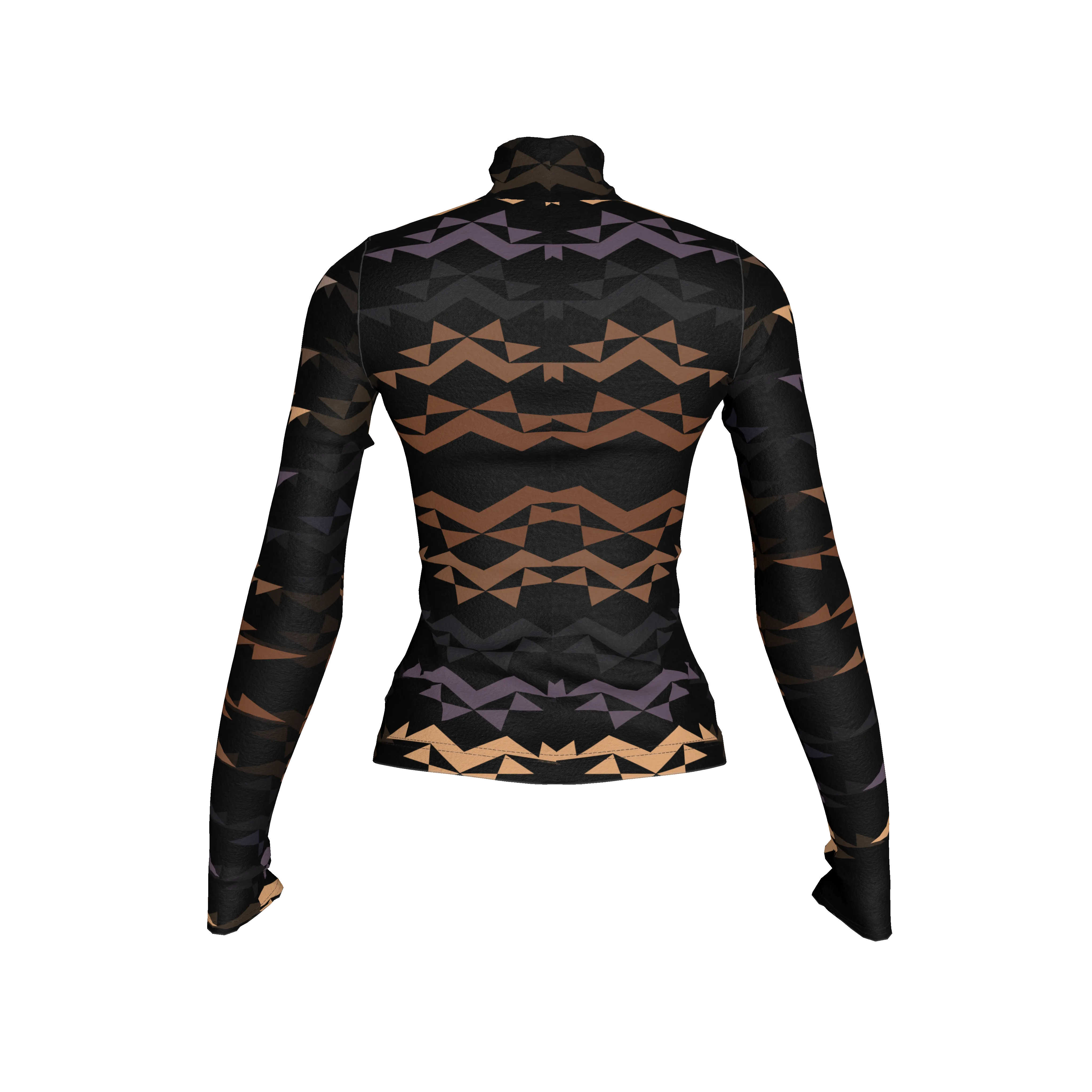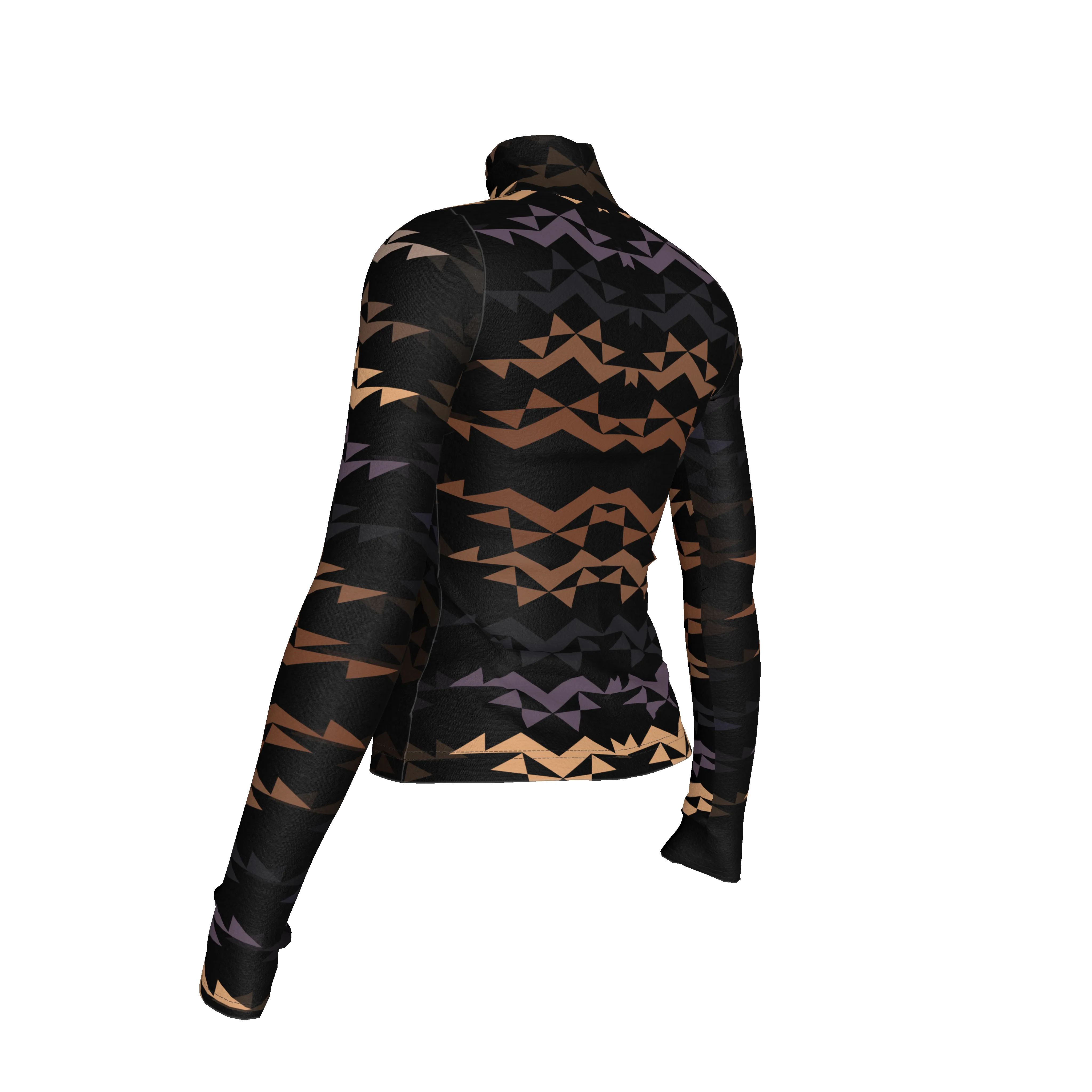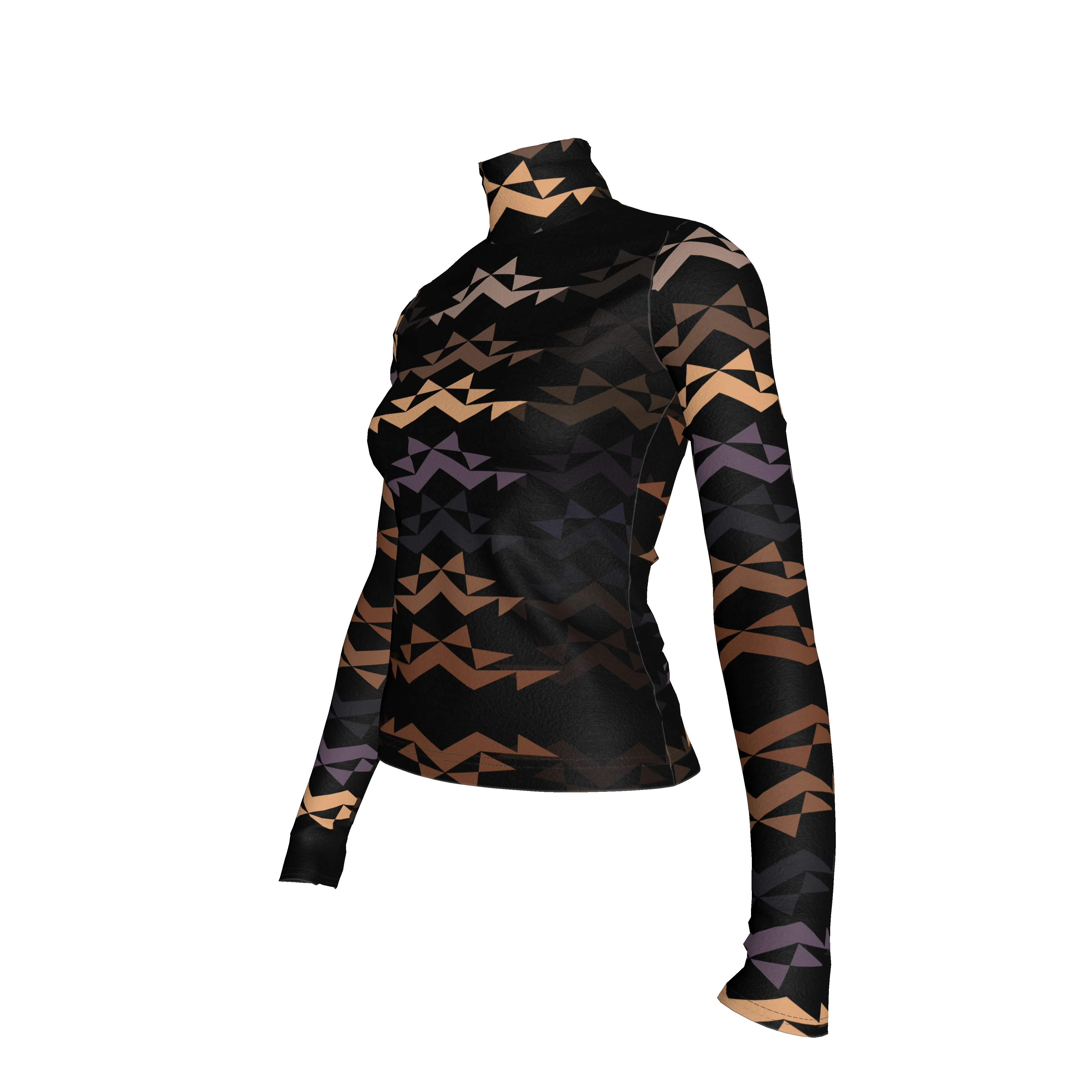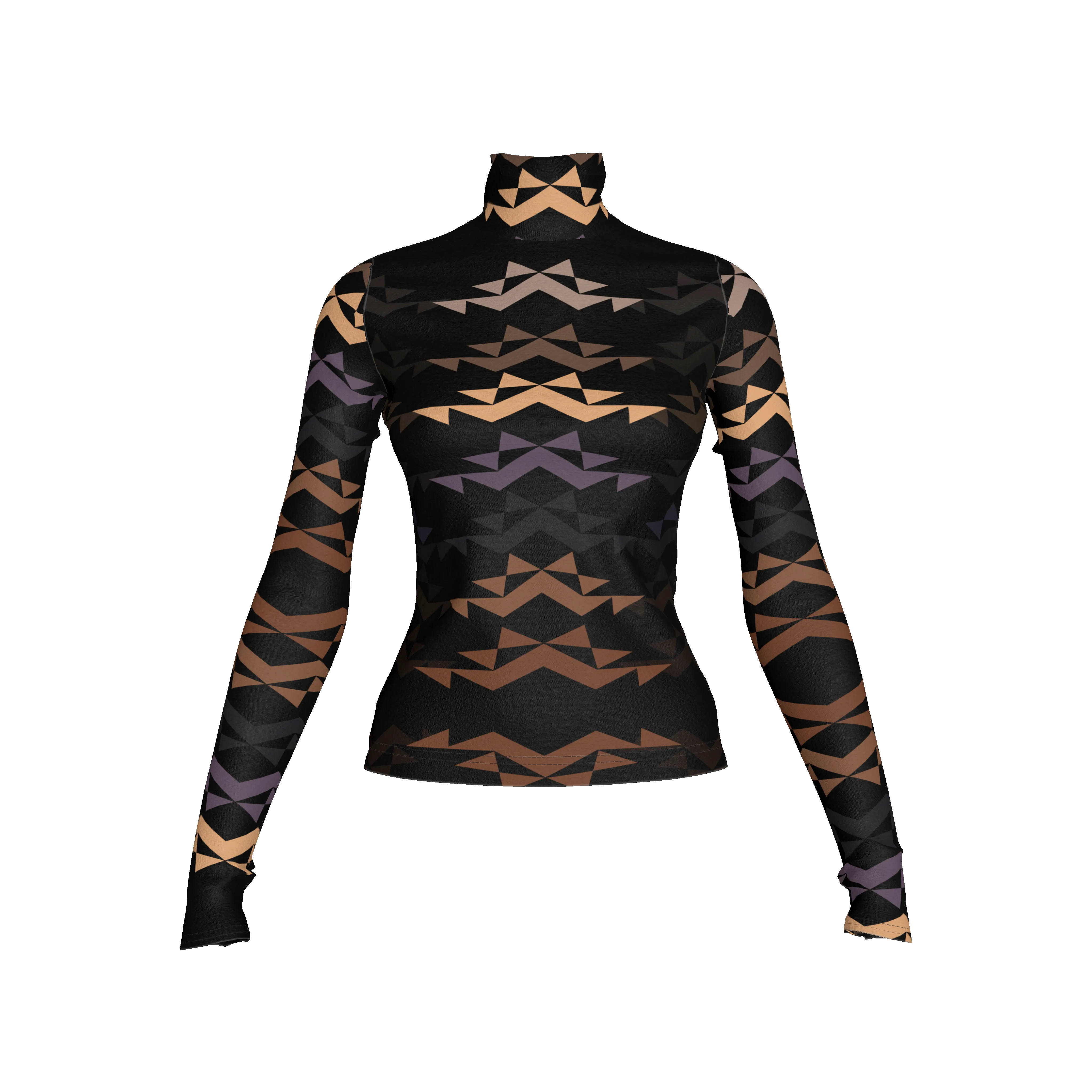 Meet your new statement staple: our Long Sleeve Turtleneck in soft, lightweight cotton-spandex jersey. The digitally printed design features bold, angular geometric motifs in earthy tan, bronze, and muted lavender set against a deep black background, creating a modern and eye-catching look. The second-skin fit stretches comfortably, making it perfect for layering or standing out solo. Style it with your favorite denim or sleek tailoring for effortless cool, any day of the week.