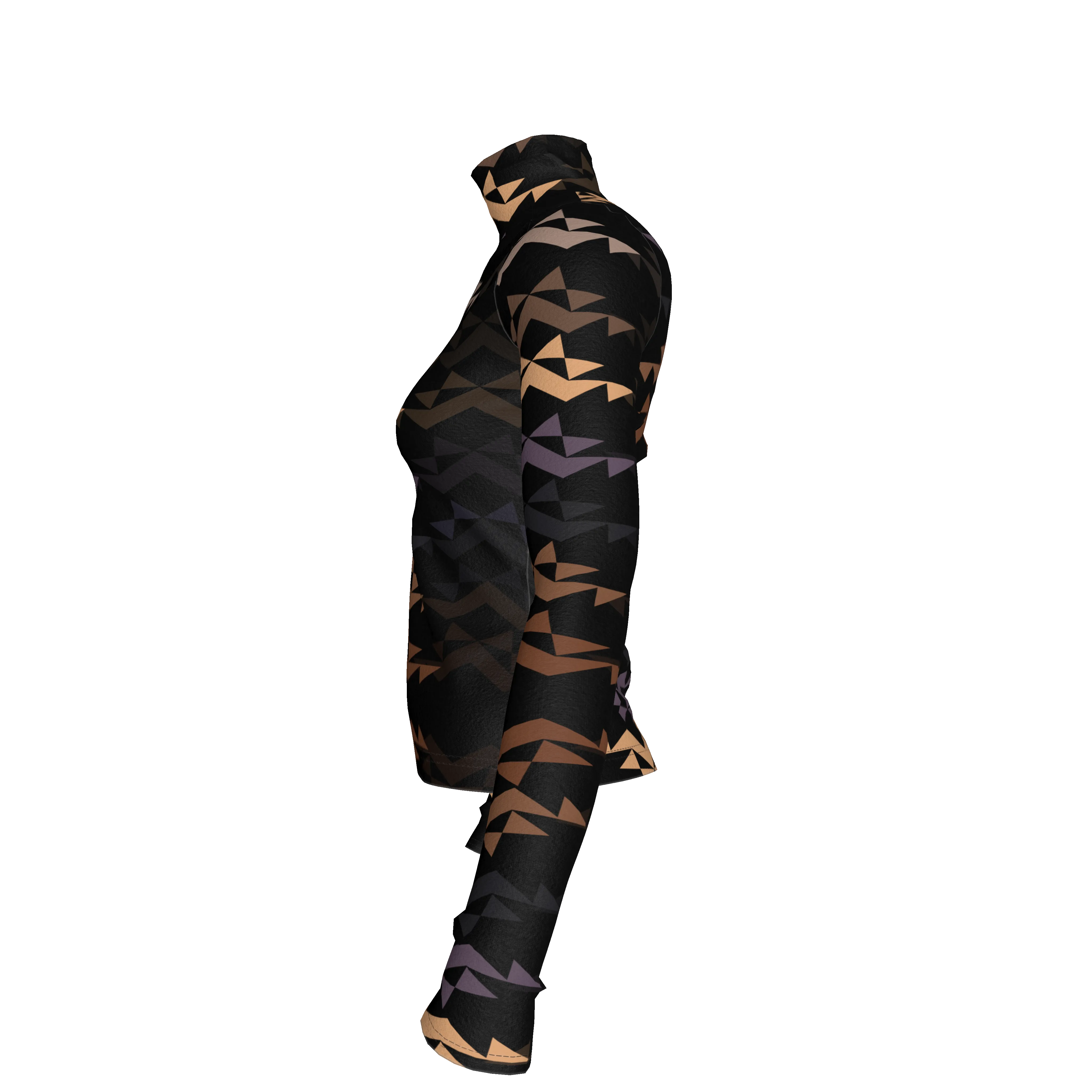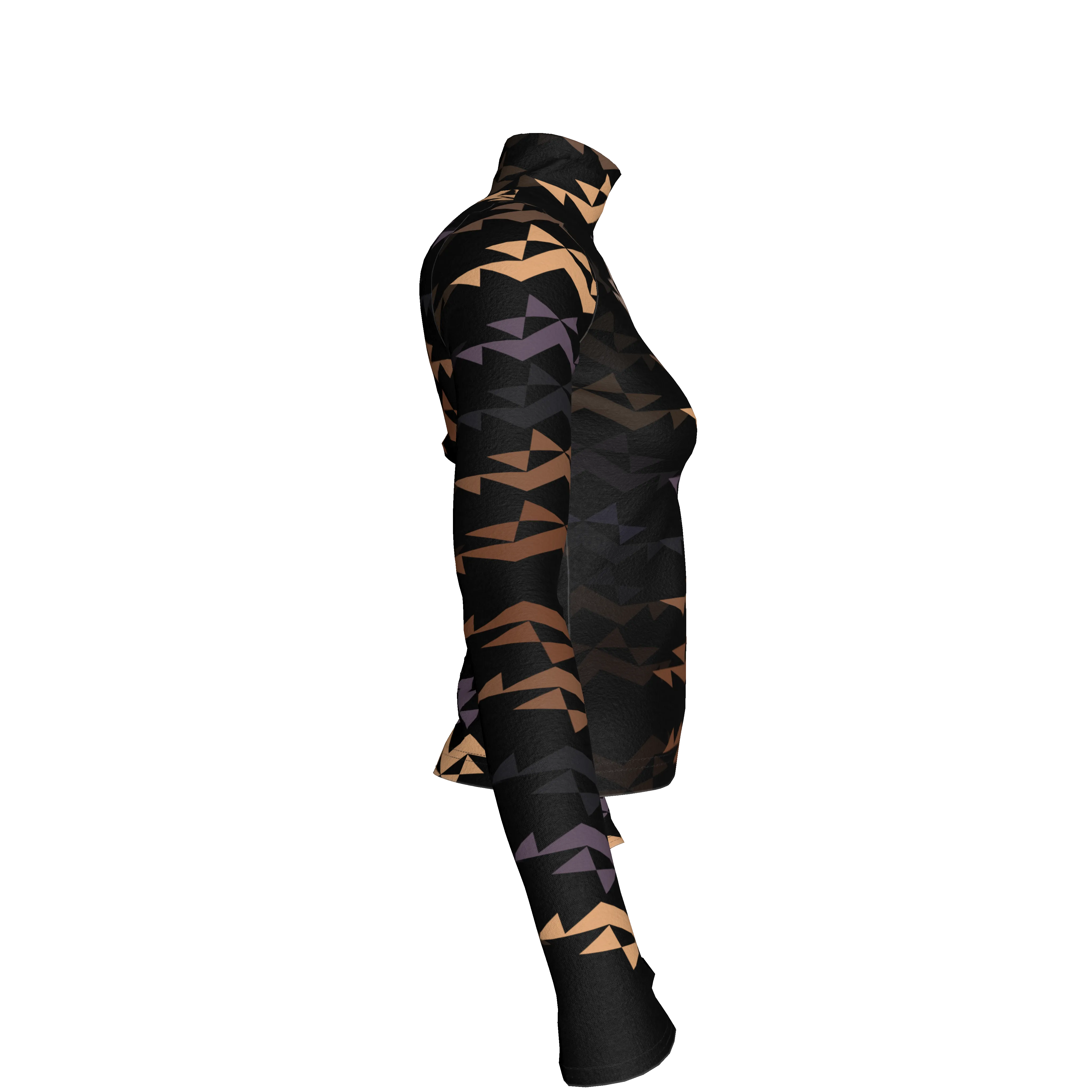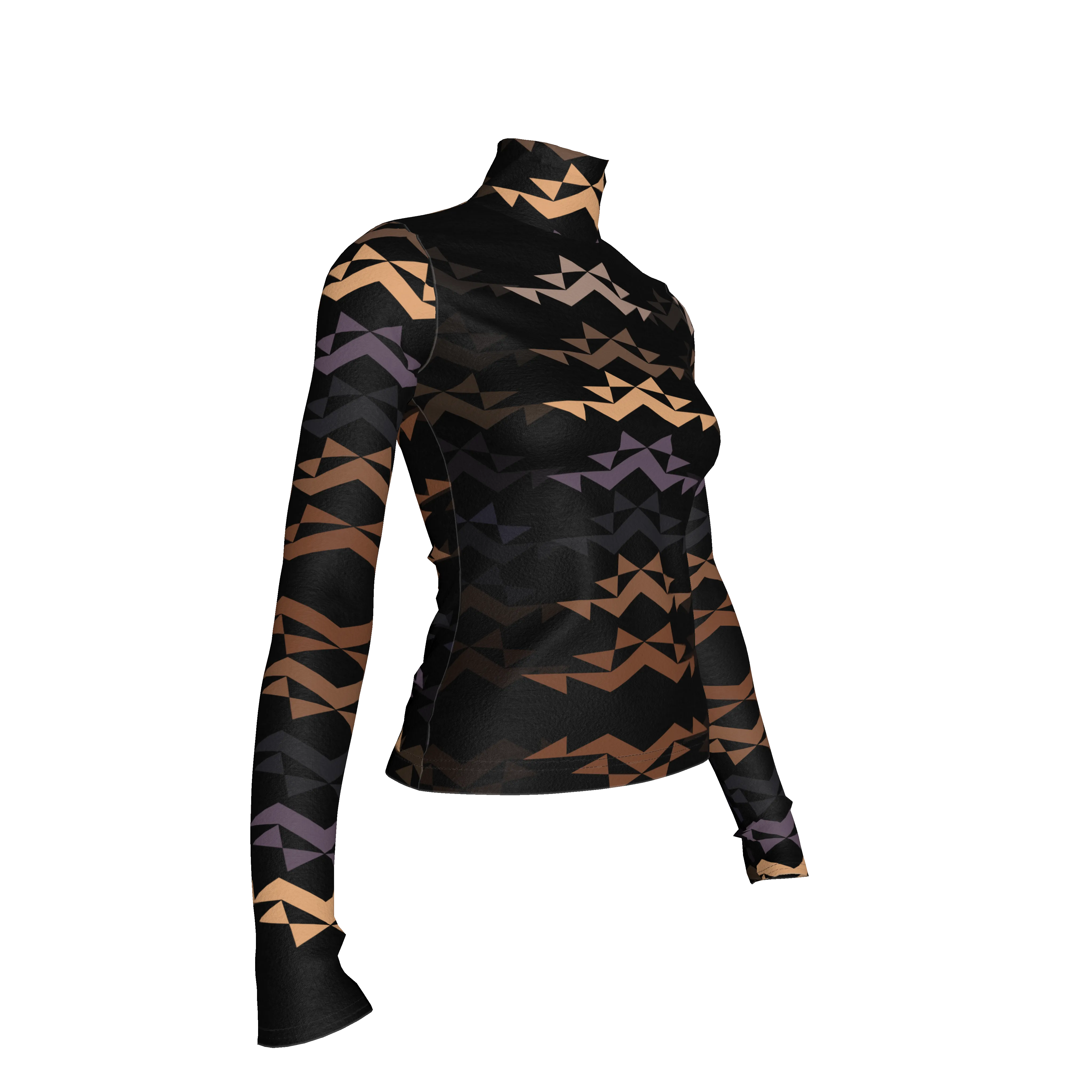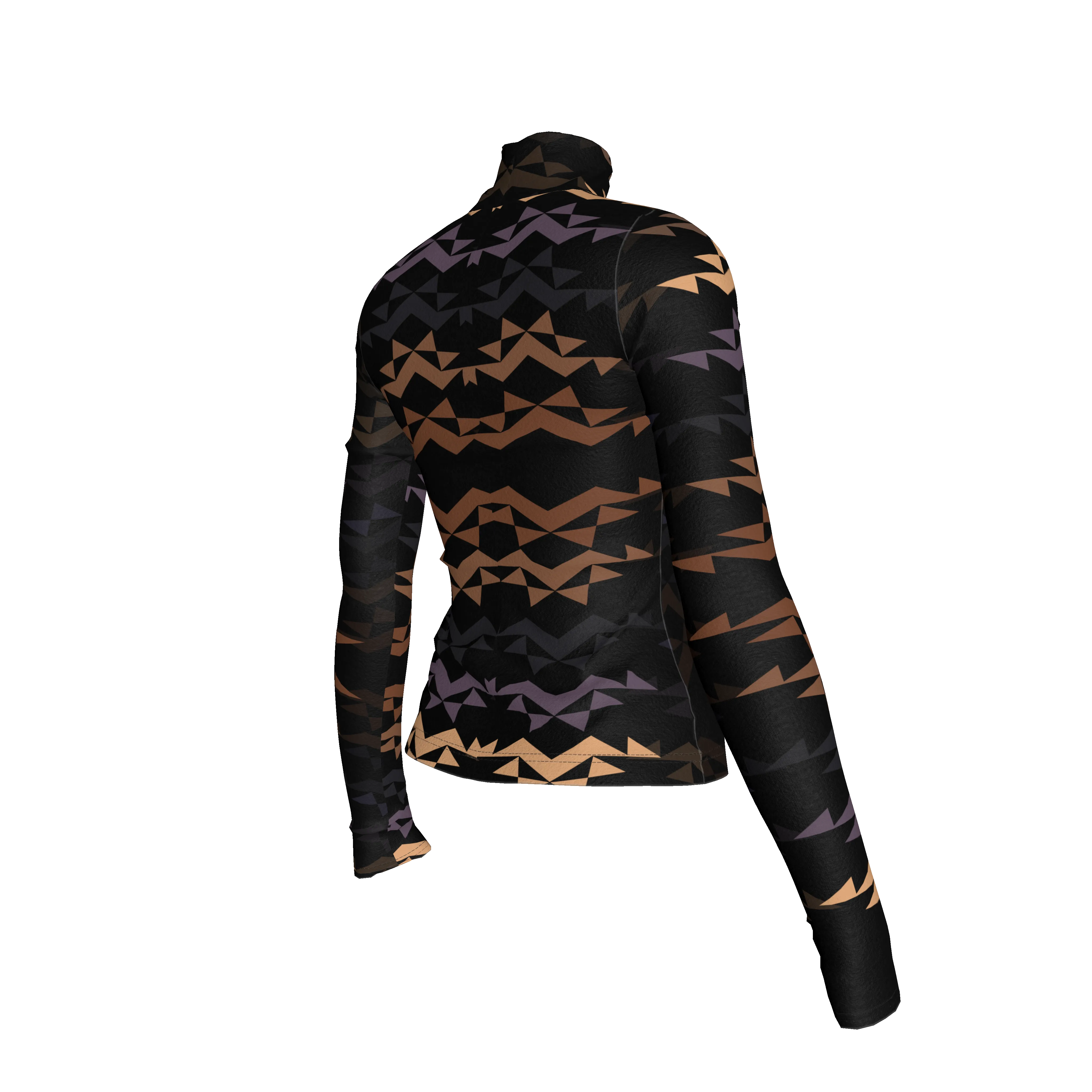 Meet your new statement staple: our Long Sleeve Turtleneck in soft, lightweight cotton-spandex jersey. The digitally printed design features bold, angular geometric motifs in earthy tan, bronze, and muted lavender set against a deep black background, creating a modern and eye-catching look. The second-skin fit stretches comfortably, making it perfect for layering or standing out solo. Style it with your favorite denim or sleek tailoring for effortless cool, any day of the week.