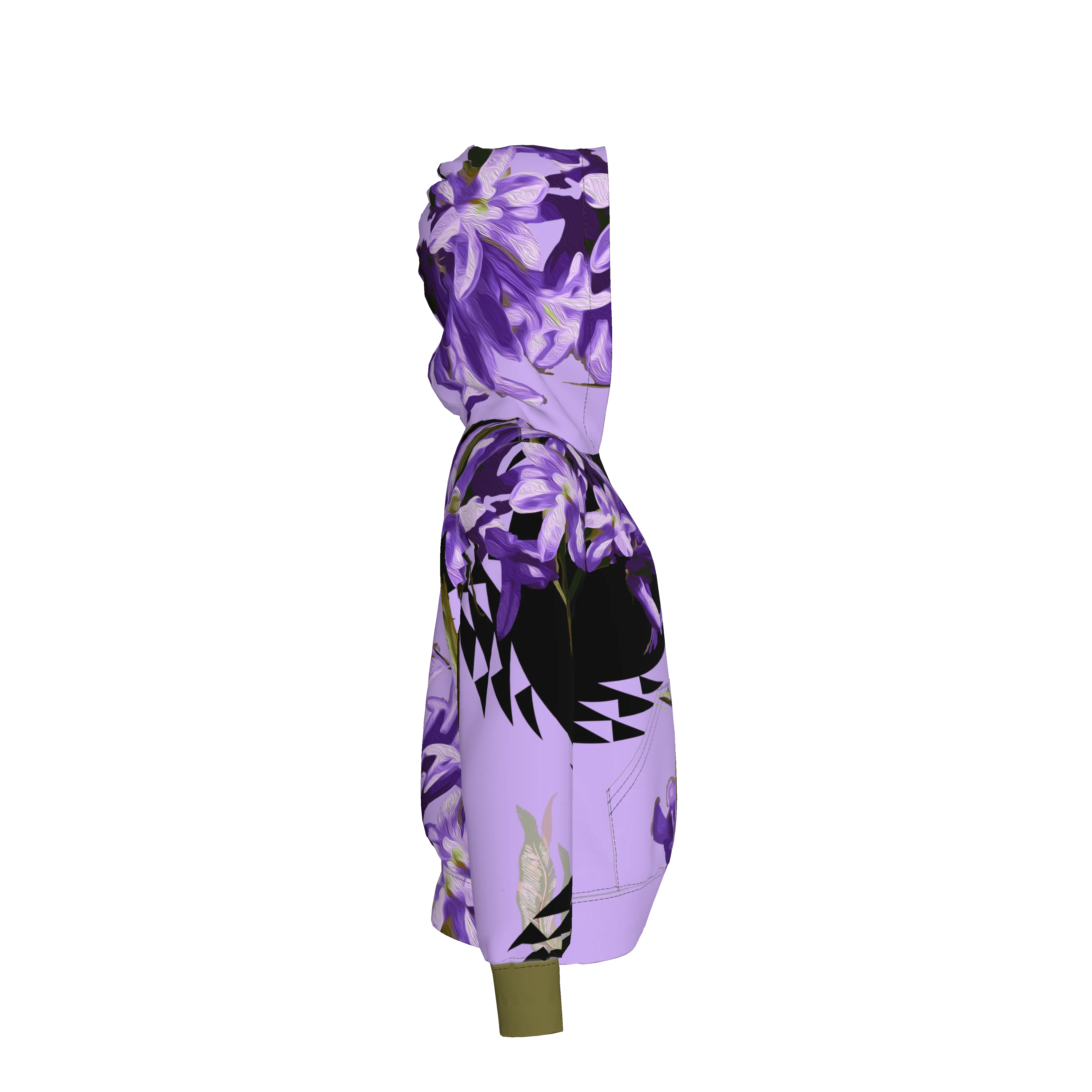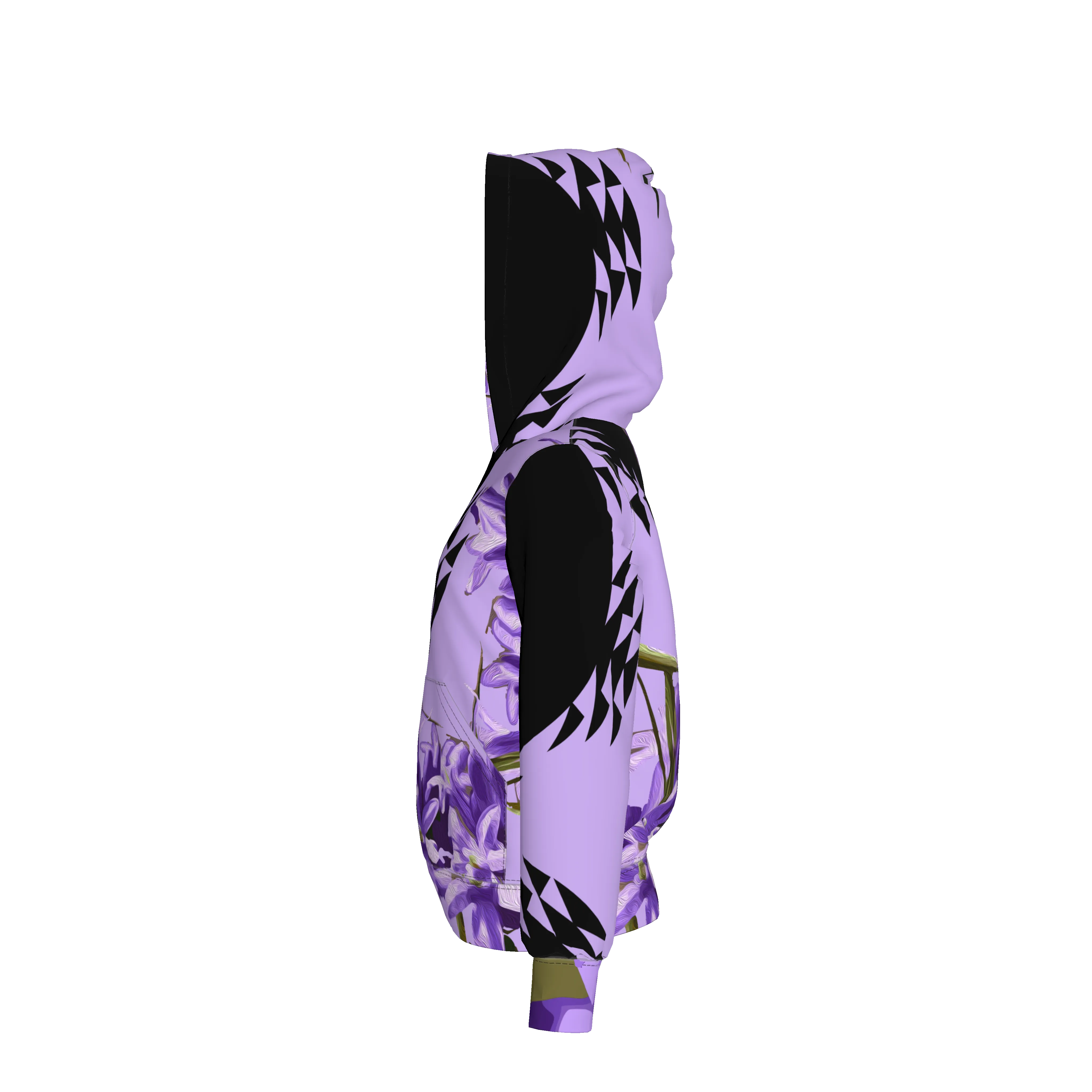 Step out in style with our pullover hoodie, crafted from 100% midweight stretch cotton for premium comfort and flexibility. This standout piece features a digitally printed design with lifelike lilac and lavender flower motifs, overlaid on a cool, soft purple base. Bold black geometric accents add a graphic edge, creating a modern contrast. With its cozy fit and eye-catching print, this hoodie is perfect for those who want to make a statement while staying comfortable.