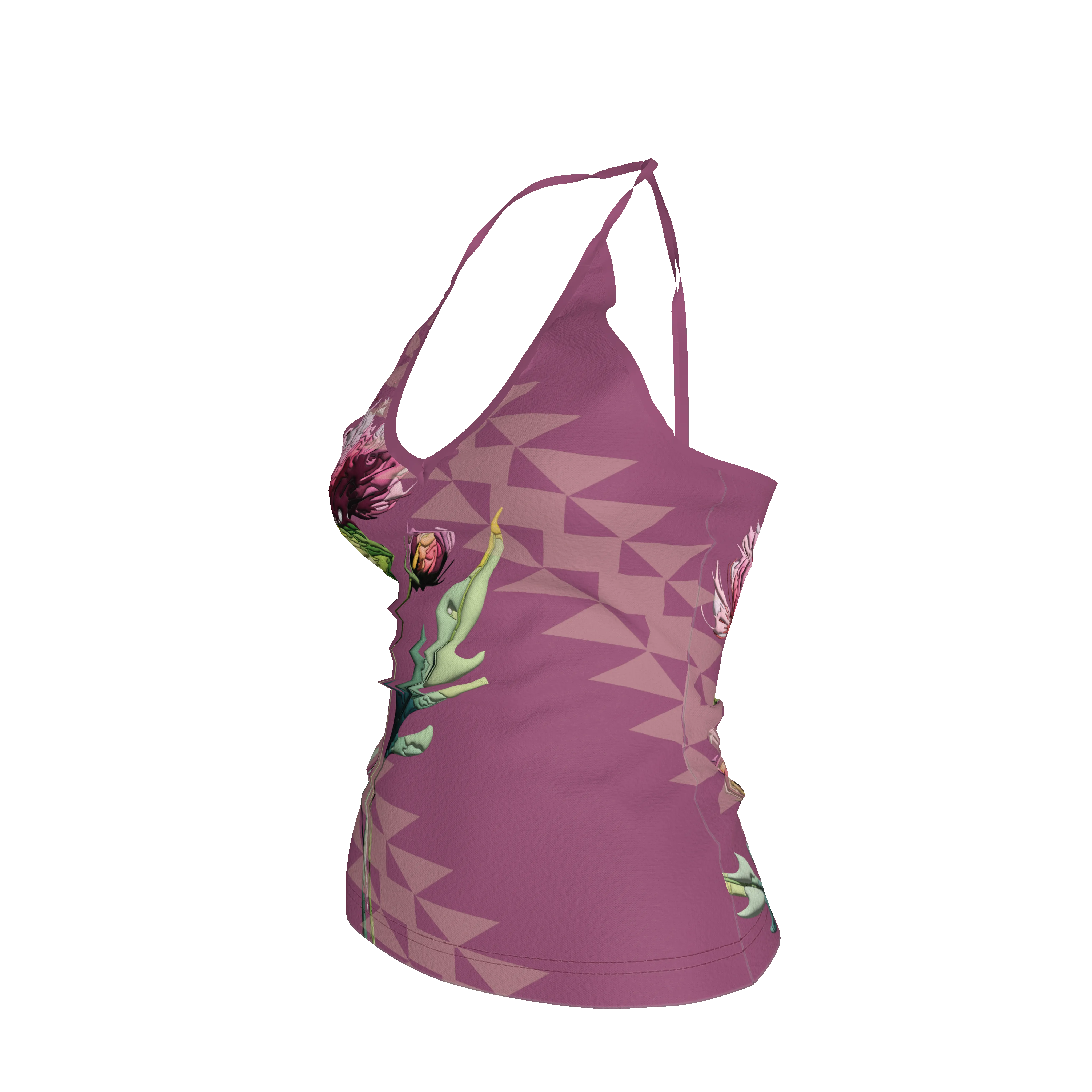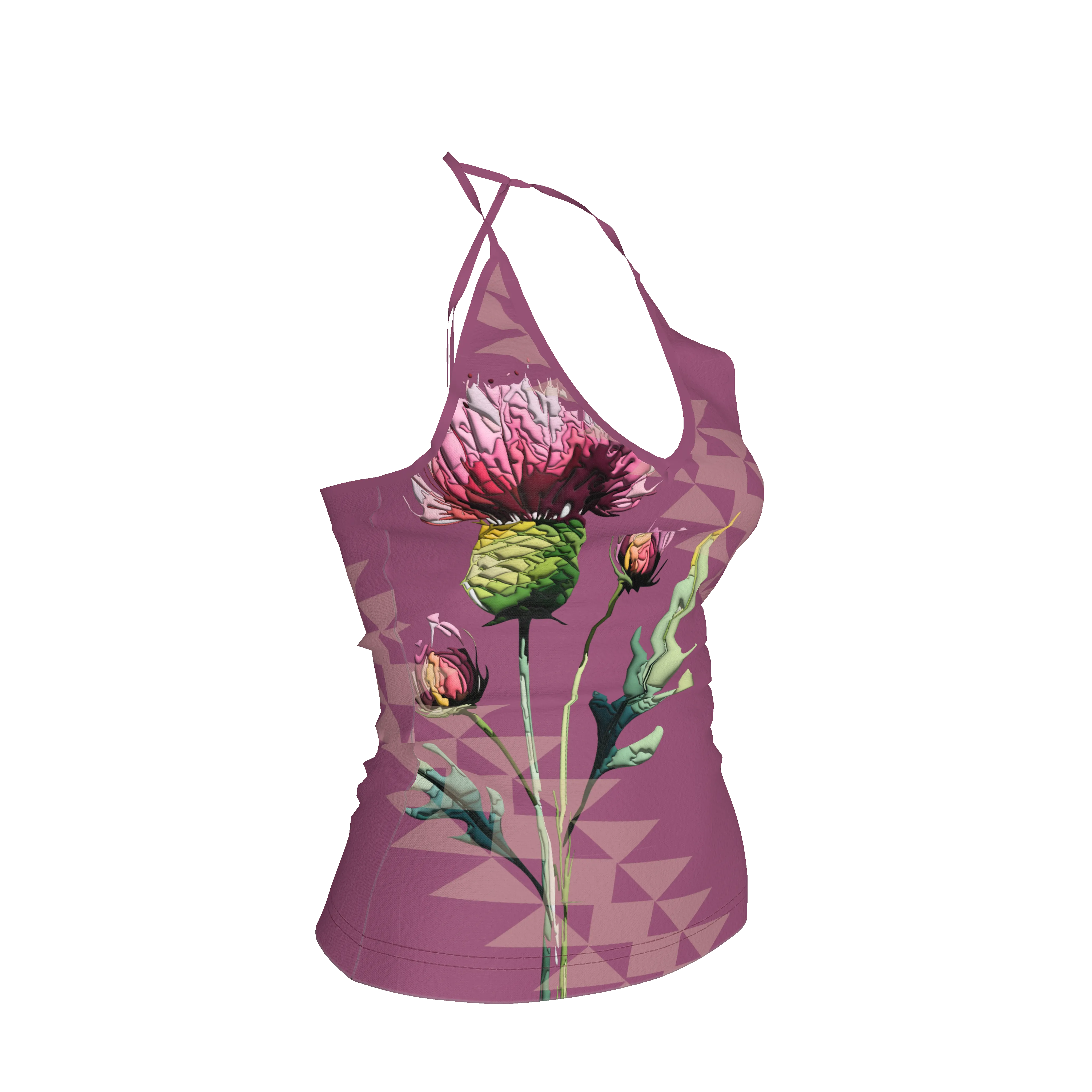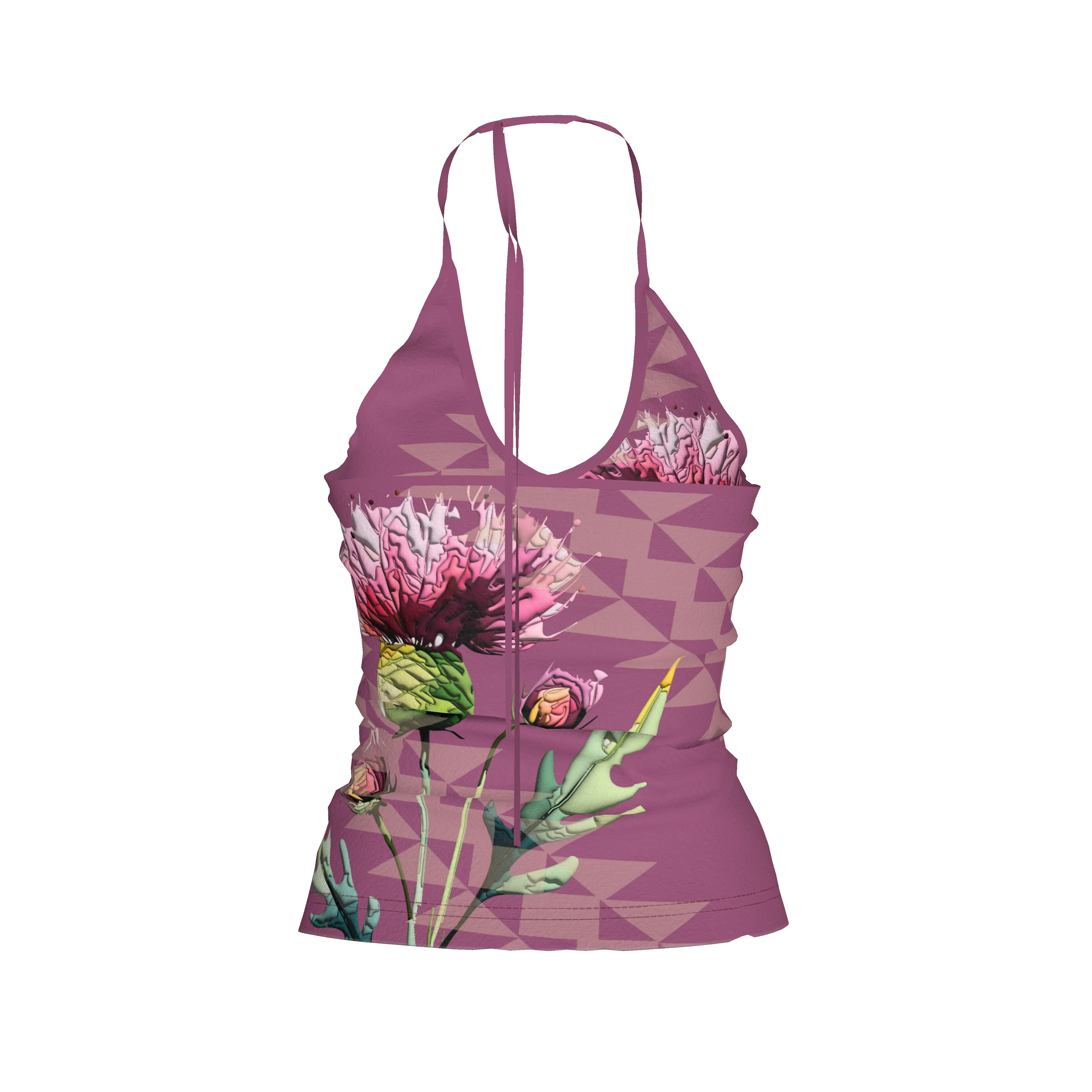 Cali Thistle; A halter top made from lightweight cotton-spandex jersey for airy comfort and easy stretch. Adjustable tie, flattering neckline, and our Cali thistle print with subtle geometric patterning—dress up or down, all day.