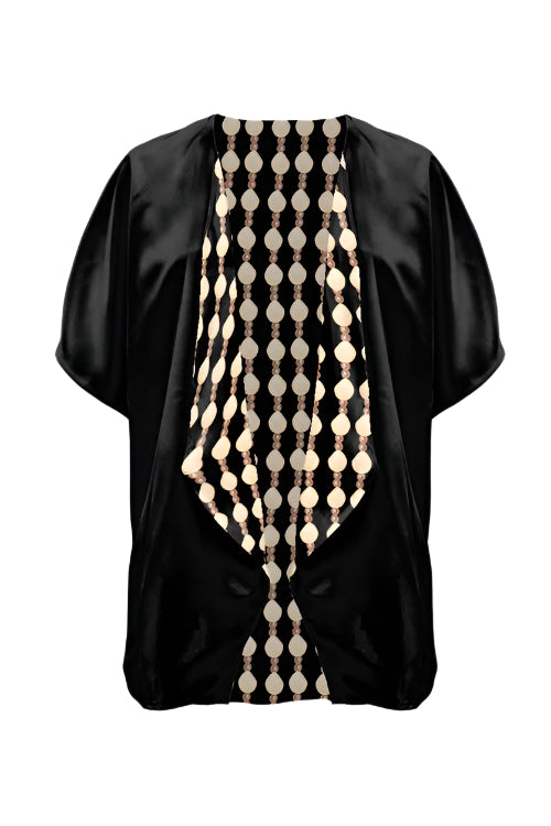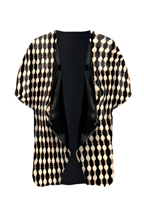 This exquisite kimono is the epitome of versatility and elegance. Crafted from luxurious satin, it features a striking clam shell design inspired by the rich cultural heritage of the Yurok, Hupa, and Karuk tribes. These delicate details celebrate the connection to the ocean and the timeless beauty of natural forms. But the true magic of this piece lies in its reversibility. Wear it with the vibrant print on display, or flip it to reveal a sleek black satin lining for a completely different look.