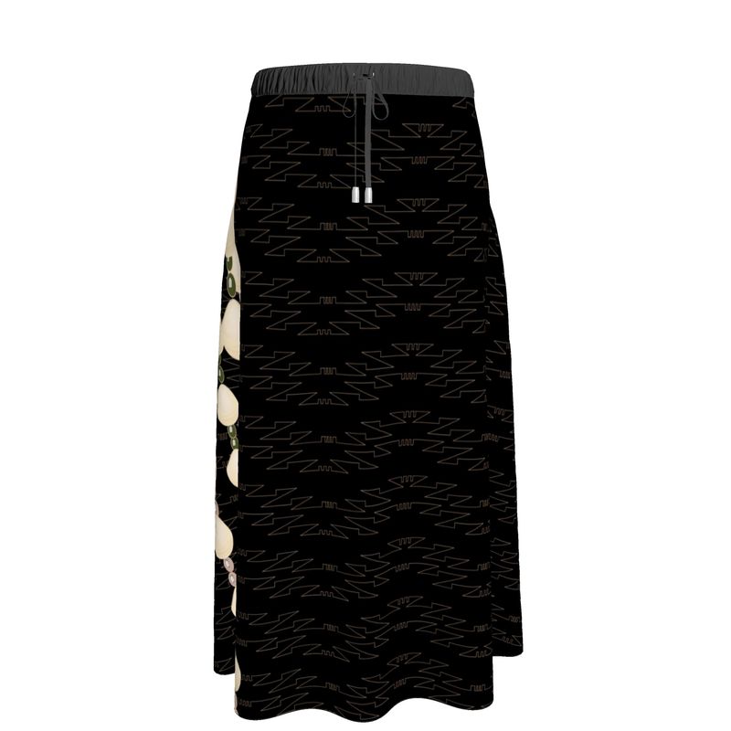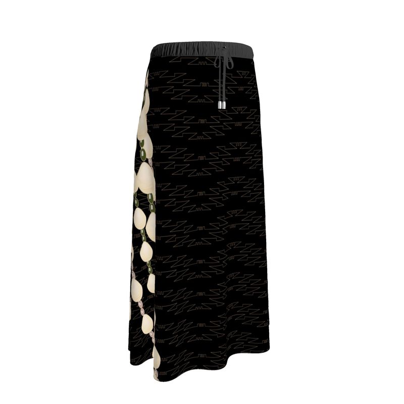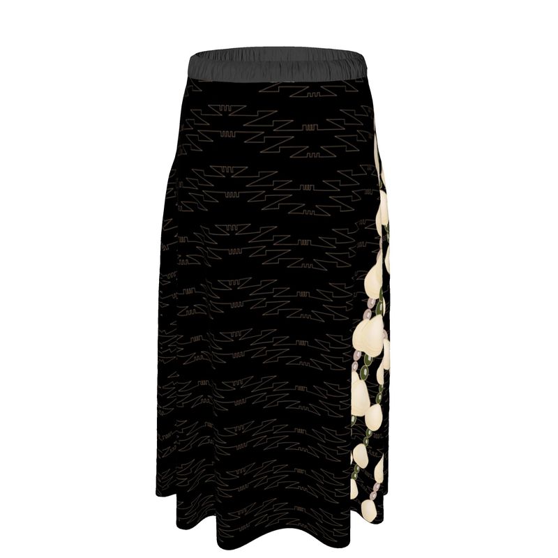 Indulge in the beauty of traditional Native American design with our exquisite designer skirt. This stunning piece features intricate clam shell and basket weave patterns, inspired by the rich cultural heritage of the Yurok, Hupa, and Karuk tribes.
