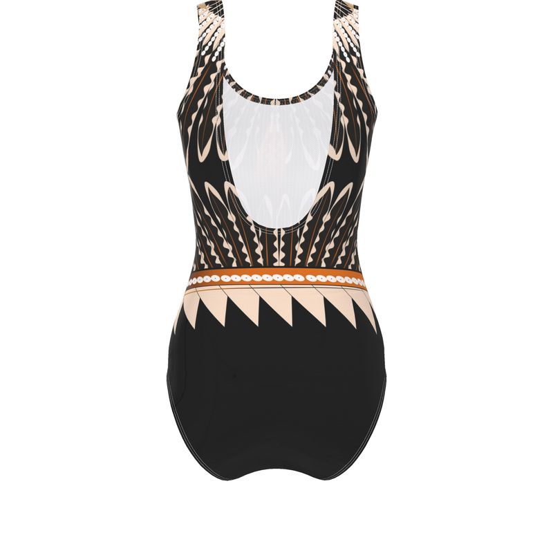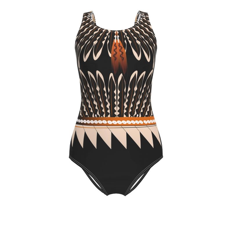 Swim suit with original flicker feather art.