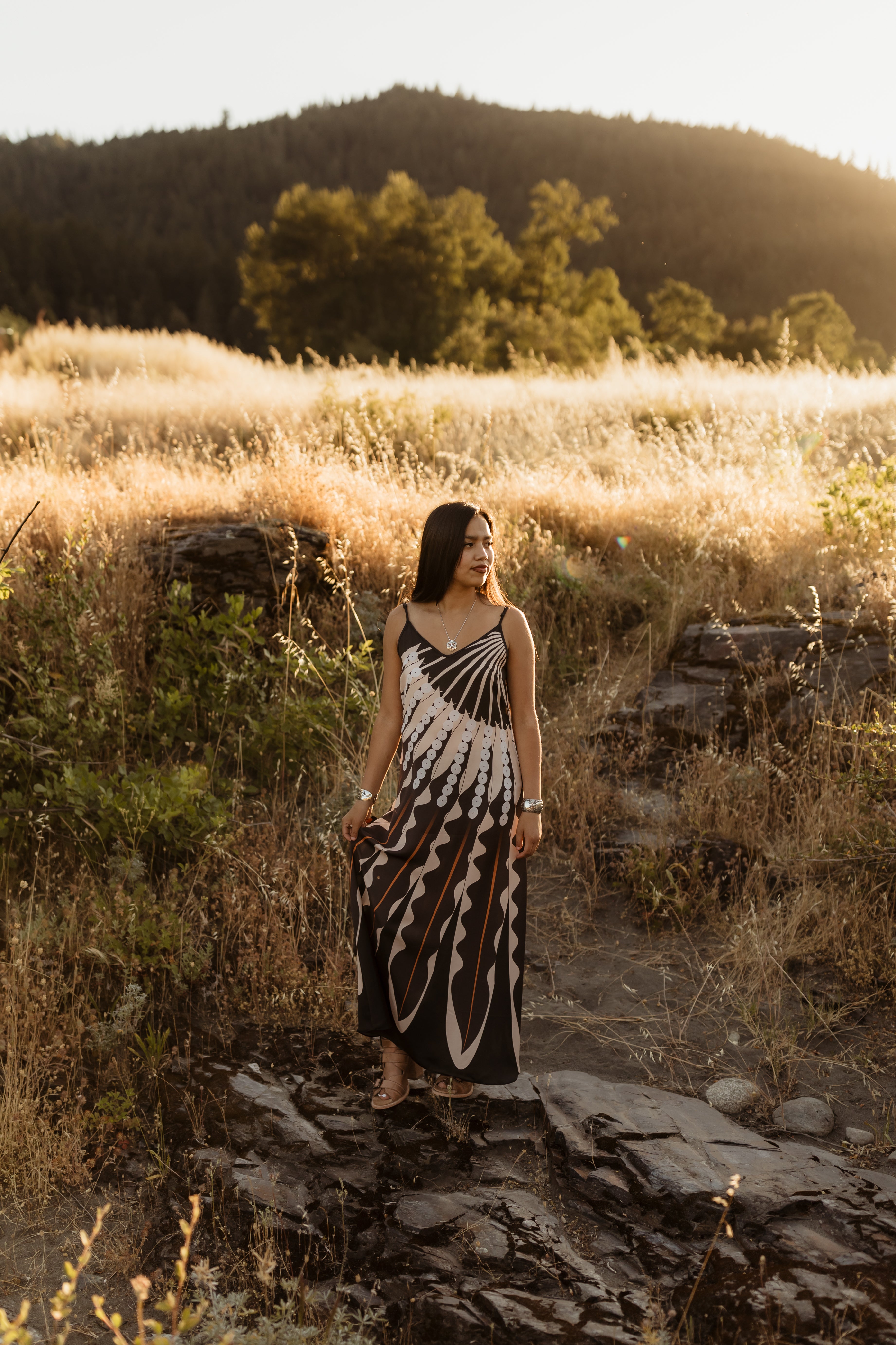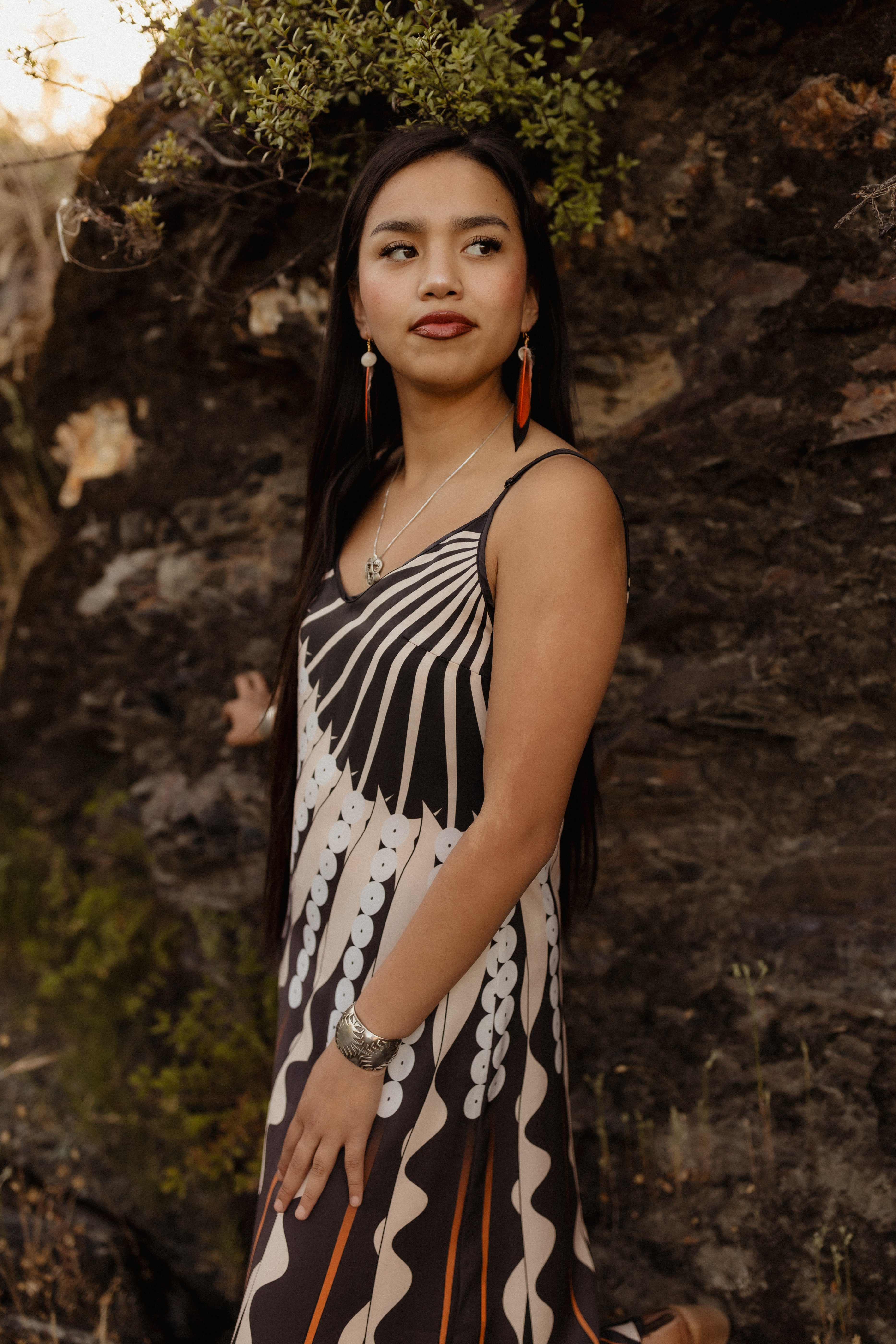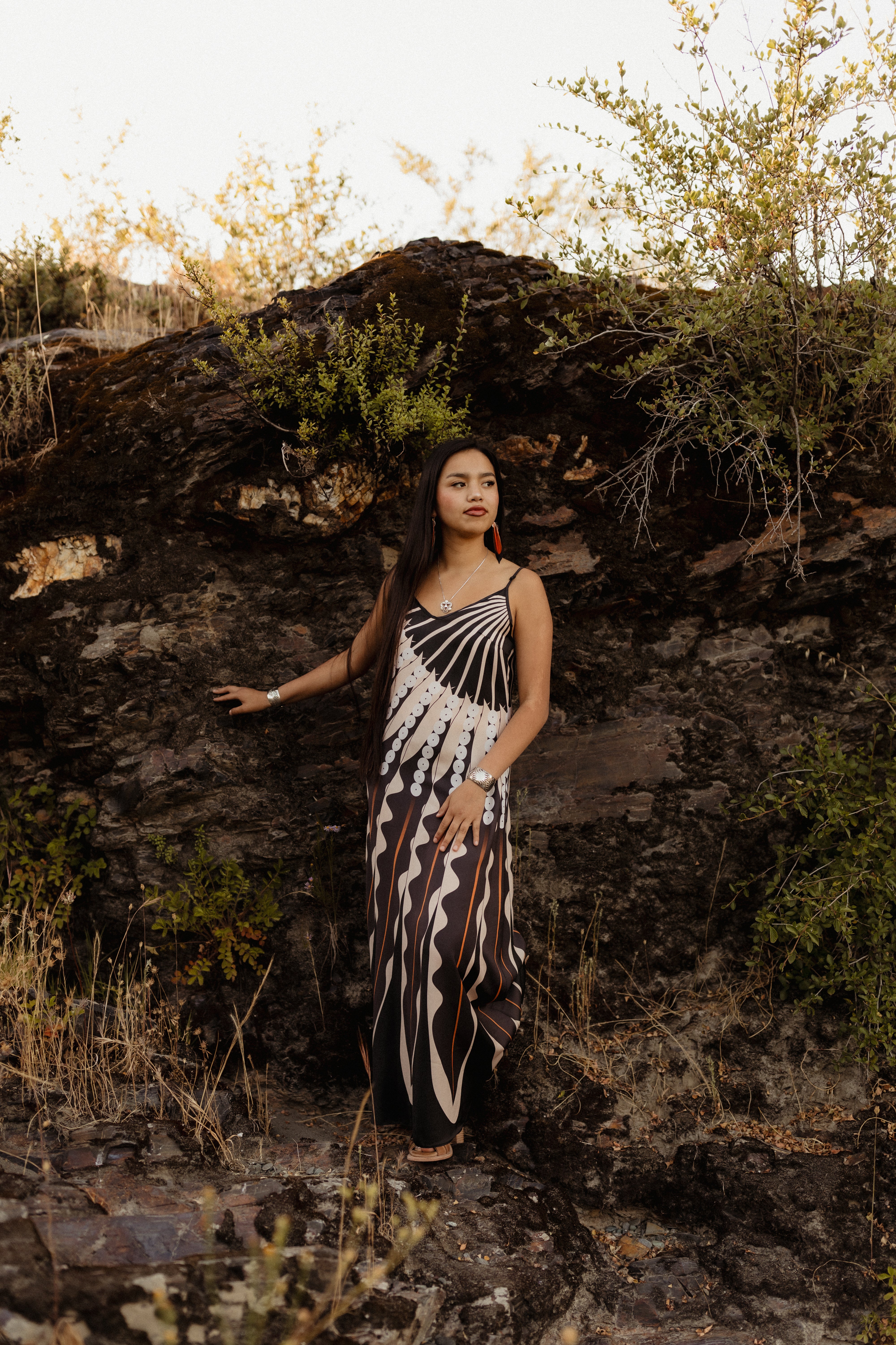Maxi dress with flicker feather. The dress fits snug around the chest. Be sure to reference the size chart for accurate measurements.