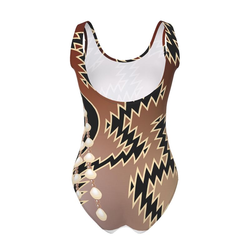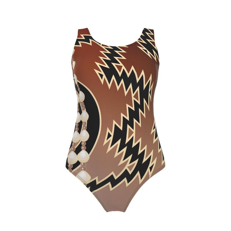 Red willow swimsuit bost beautiful natural tones with basket design and clamshells.