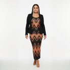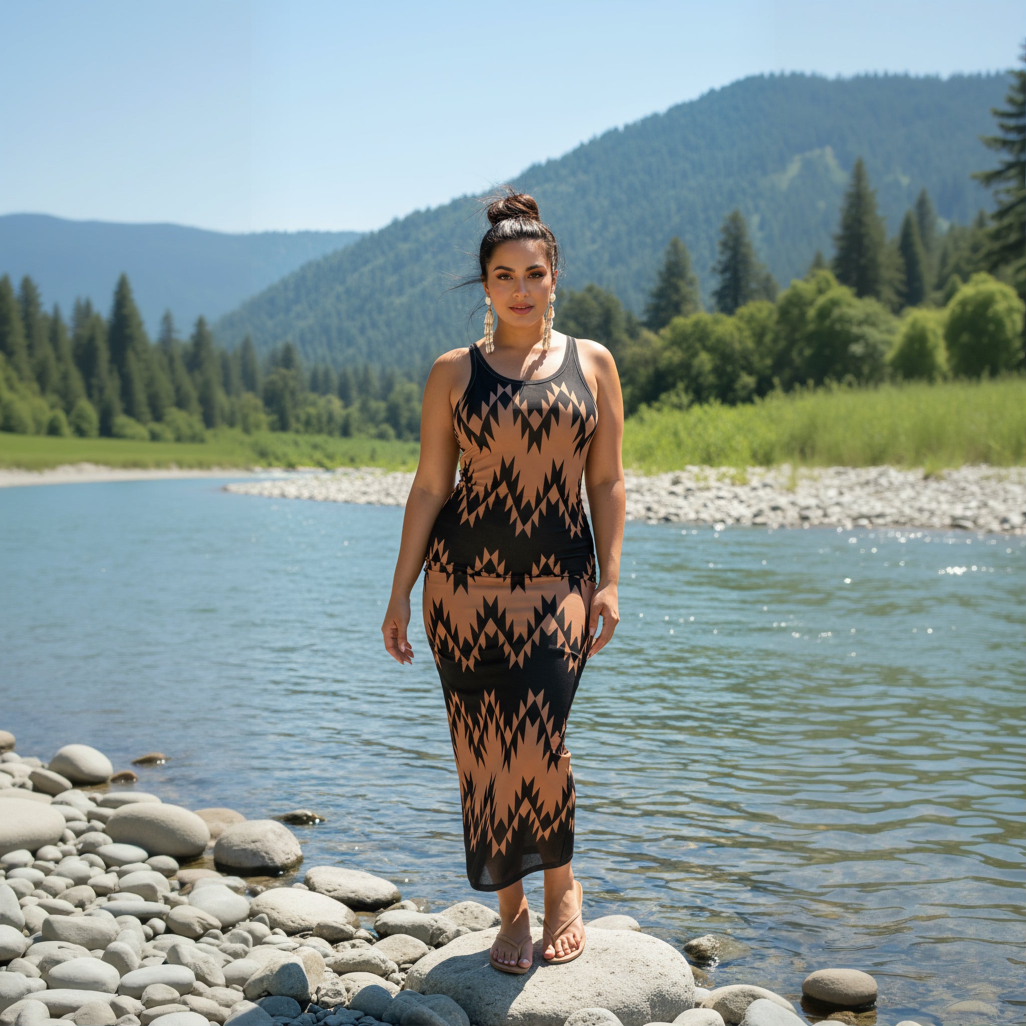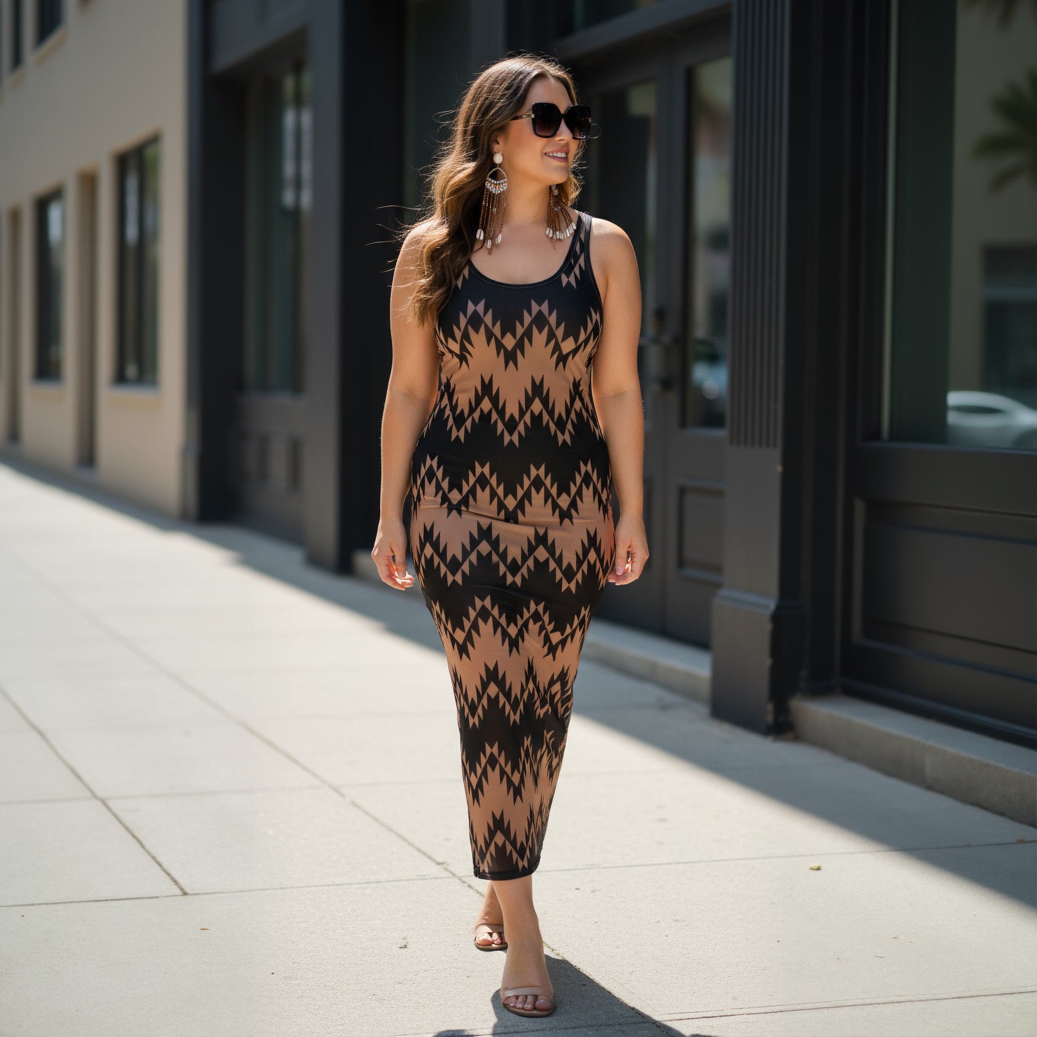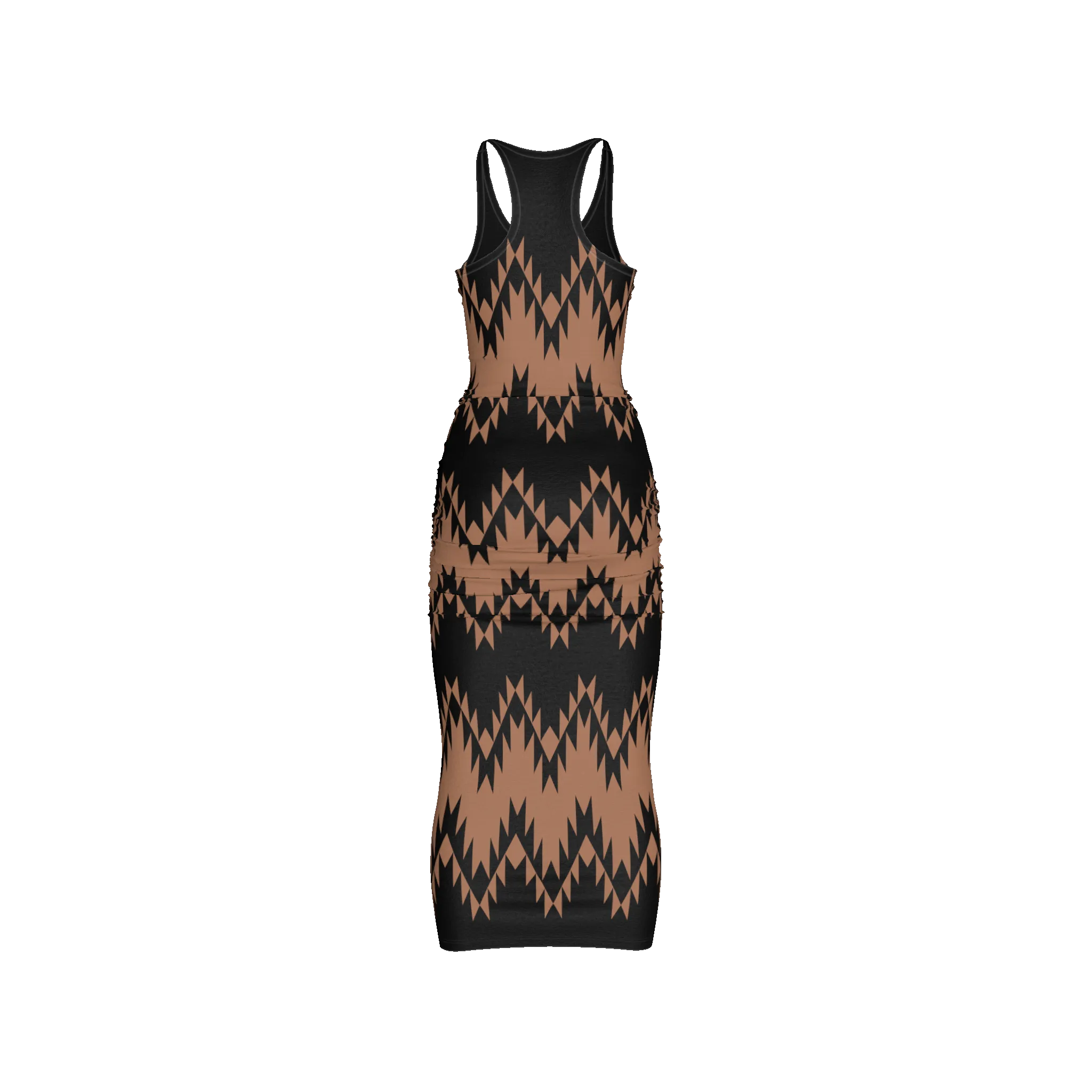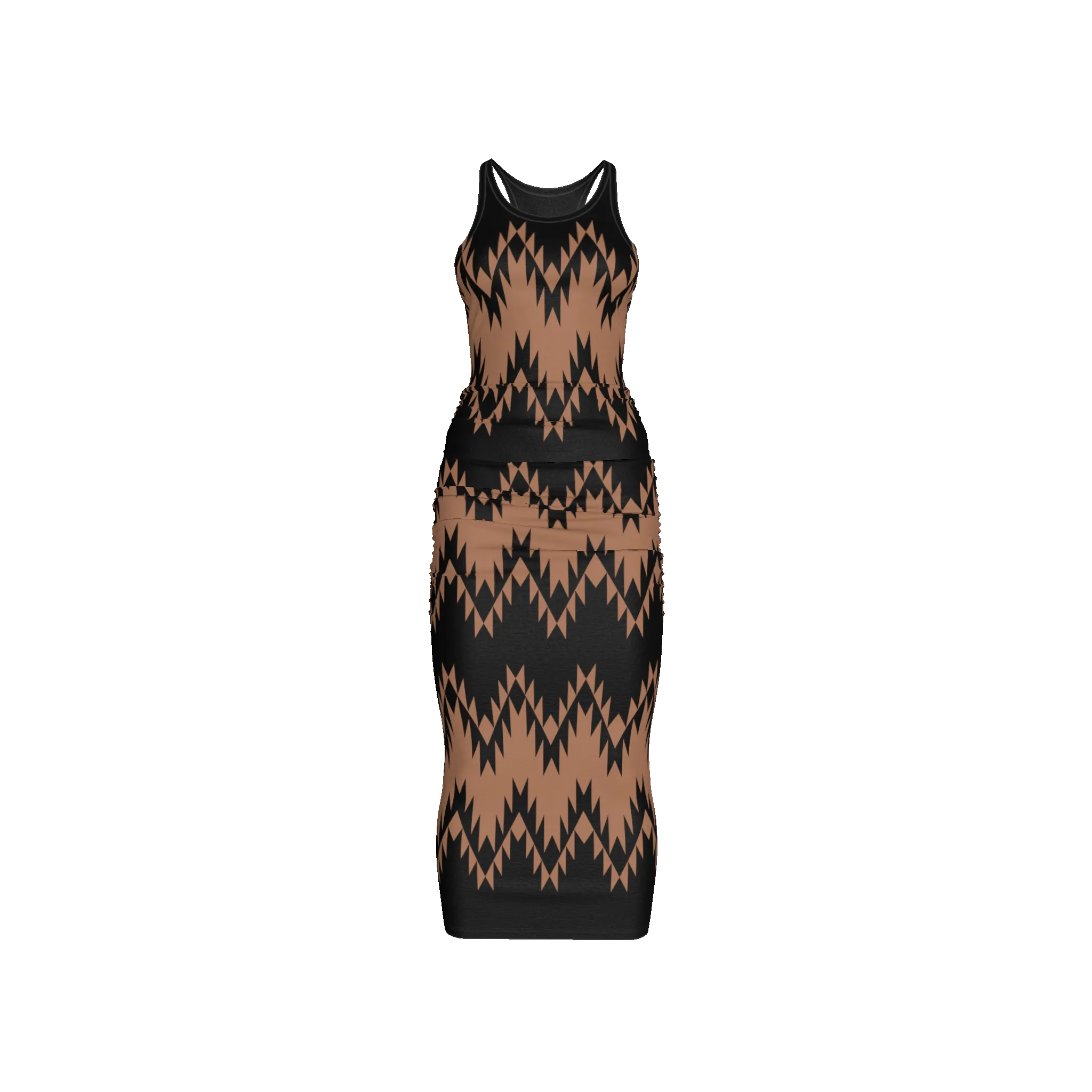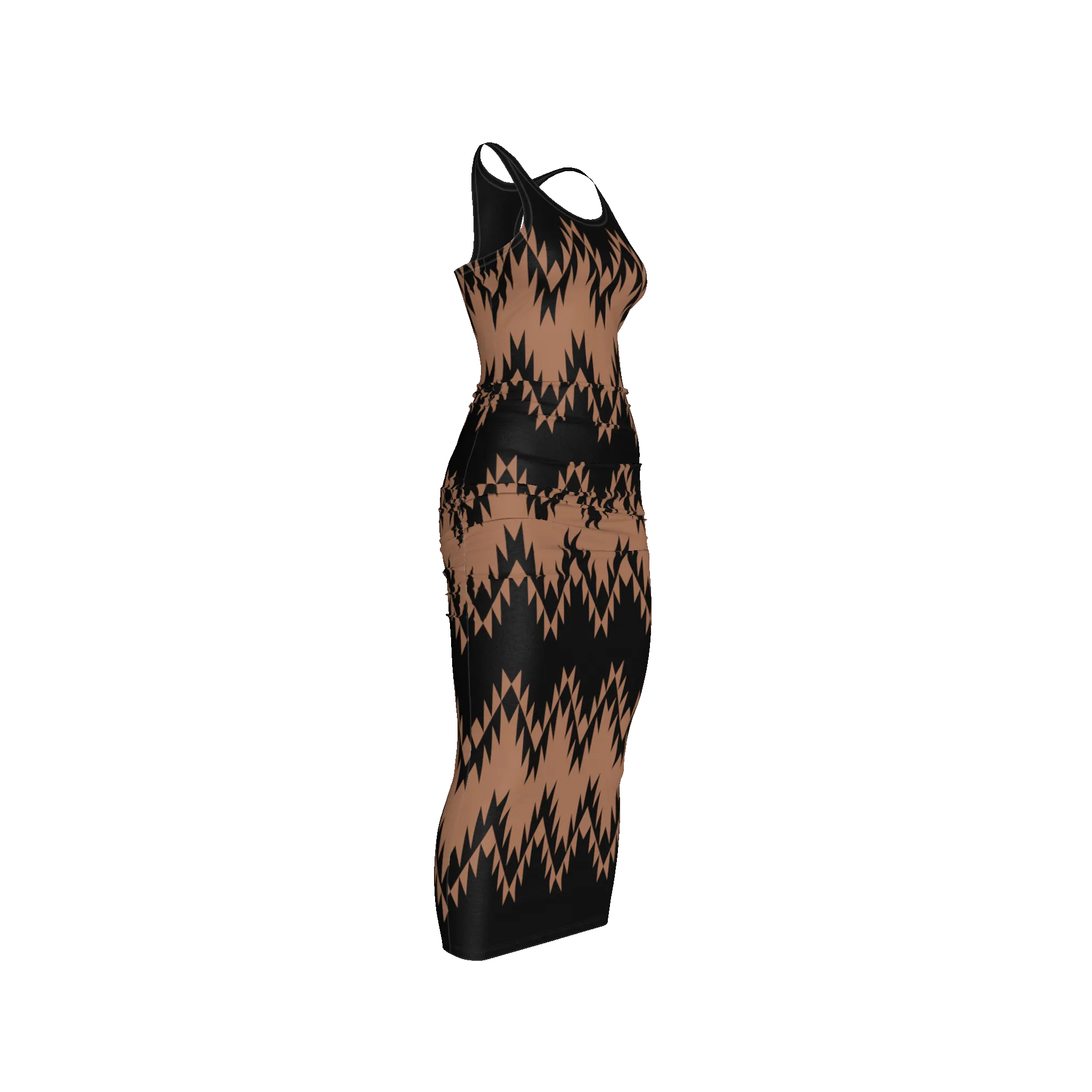 A sleek, body-skimming racerback dress featuring Mermery’s signature swallows tail design in warm tan over deep black. The pattern contours the body to create a long, clean line, while the midi length keeps it polished for day or night.