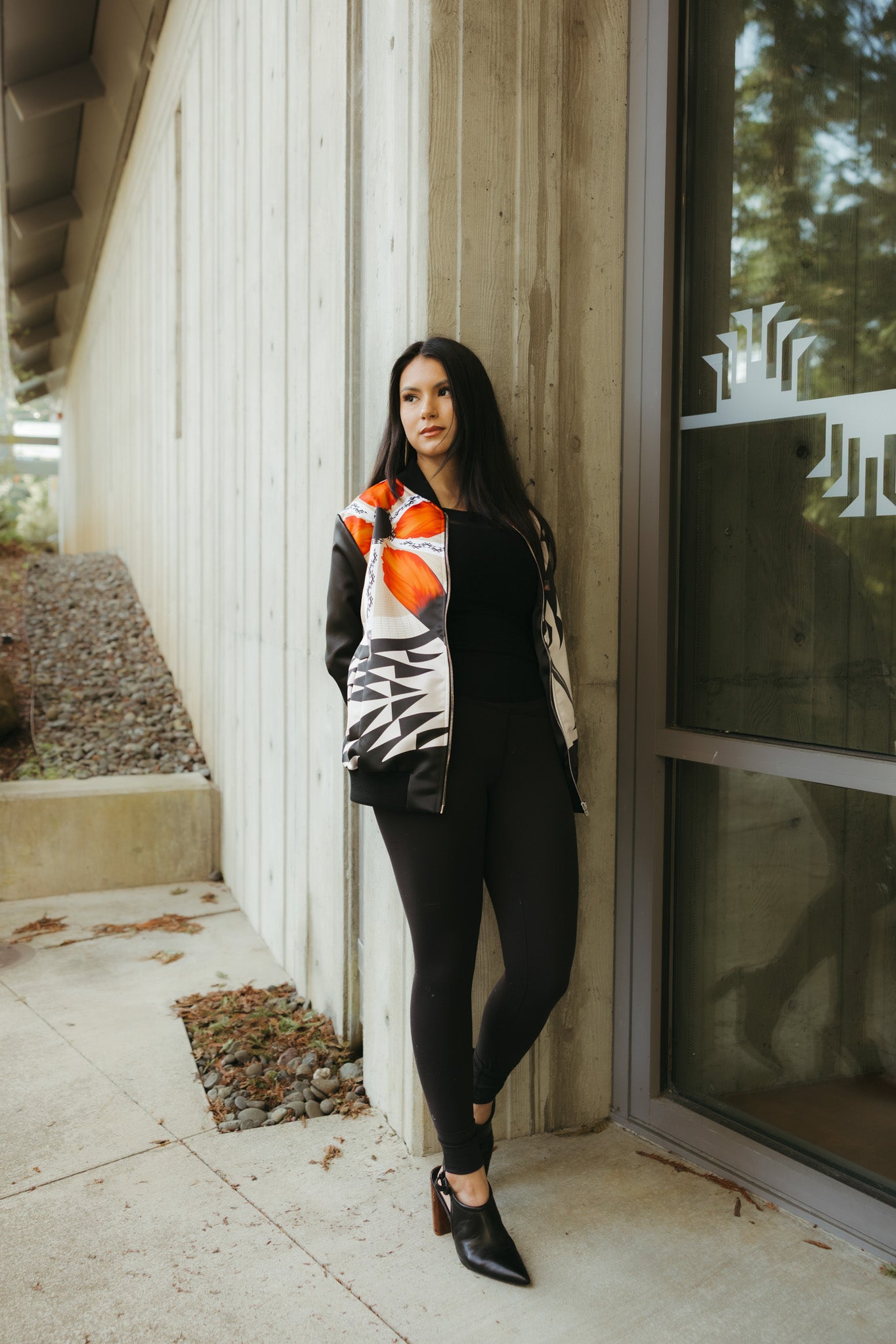 Ladies bomber jacket with woodpecker and cap design.